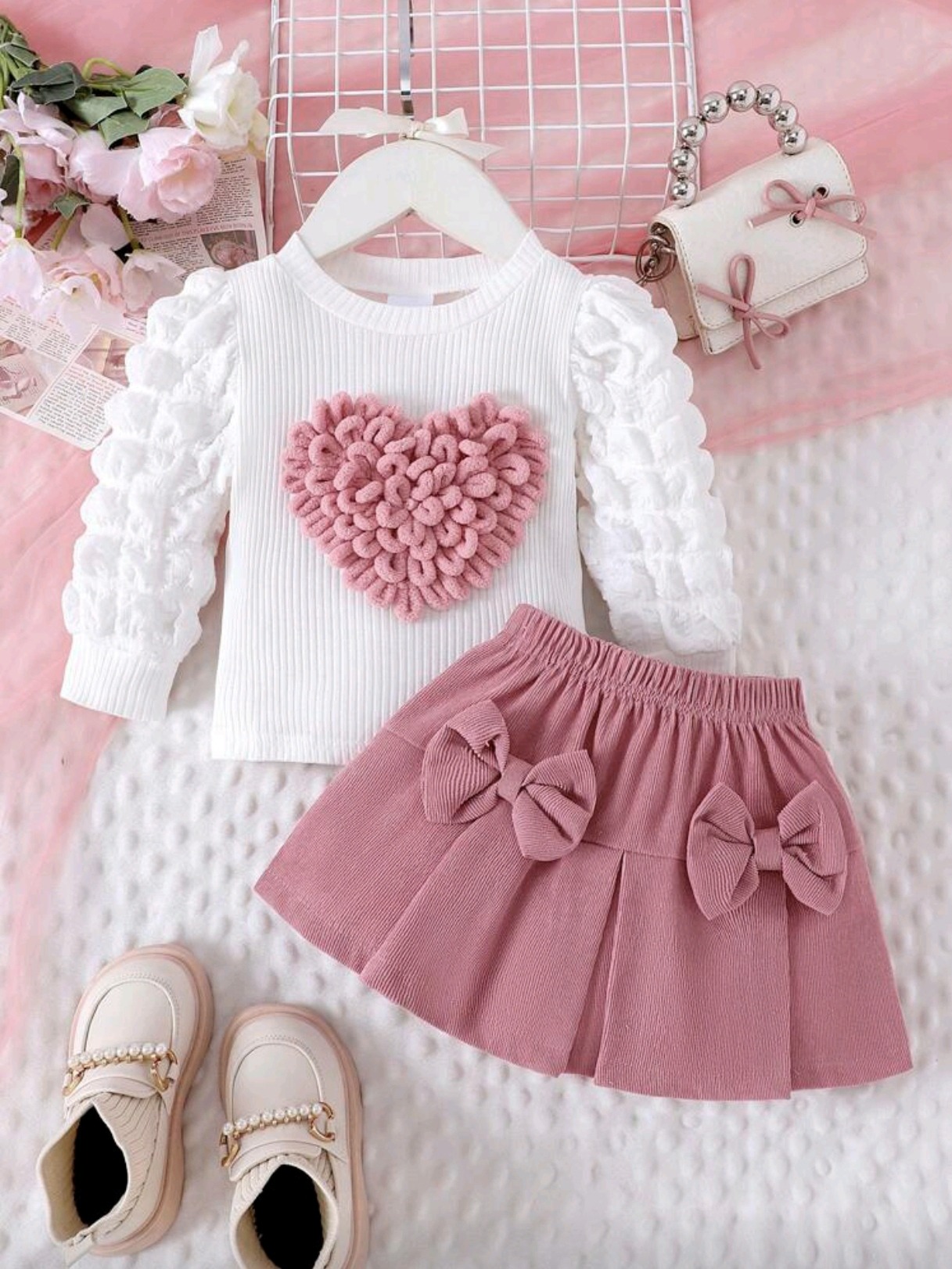 2 Piece Toddler Girl Set – Heart Puff Sleeve Top & Skirt Outfit