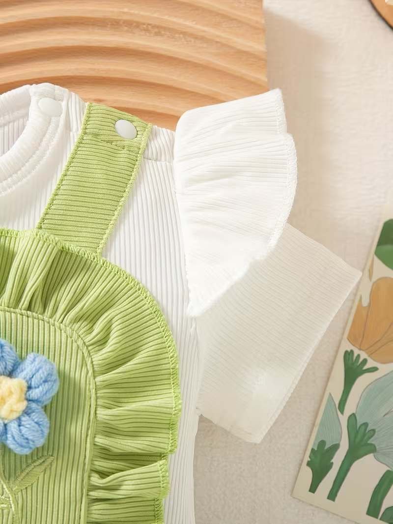 Adorable 3D floral embroidered romper with ruffle sleeves, paired with a matching hat — perfect for a cute and comfy summer look.