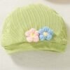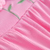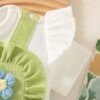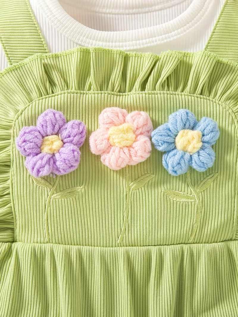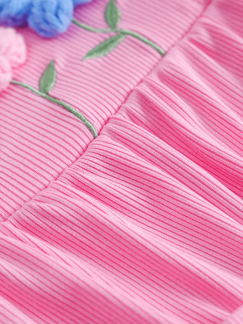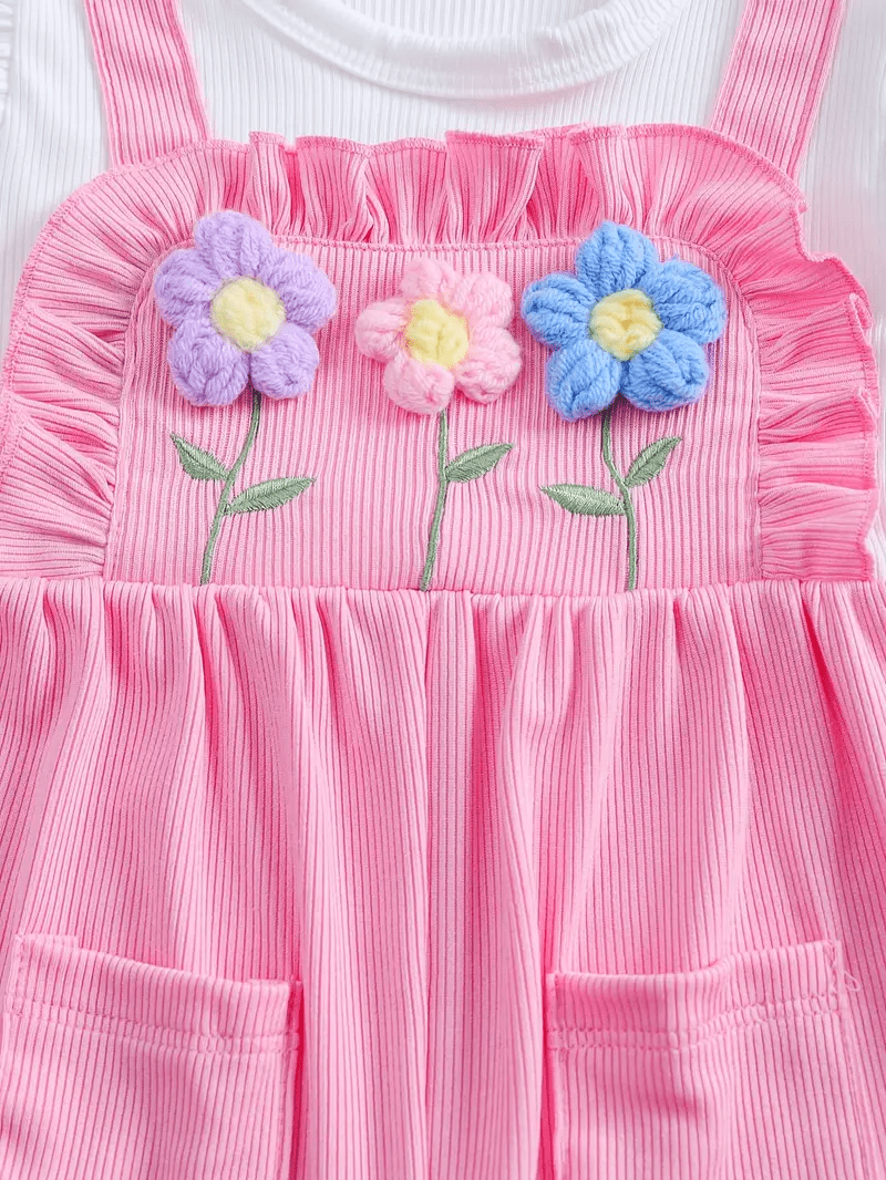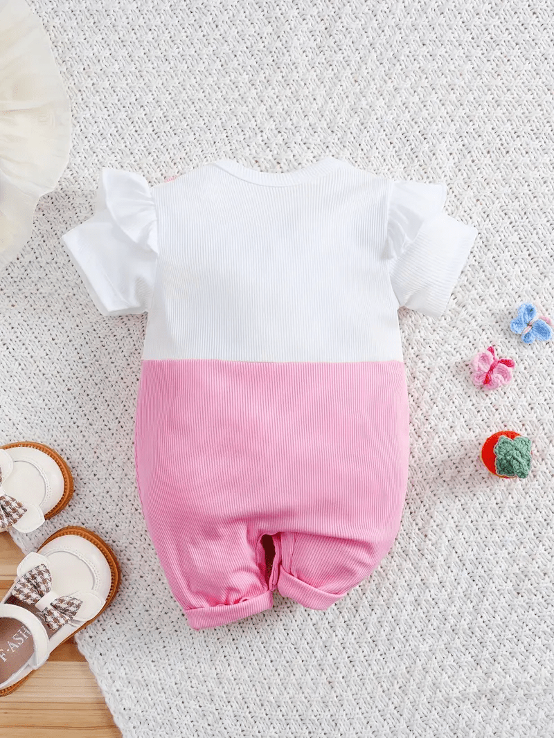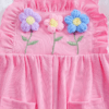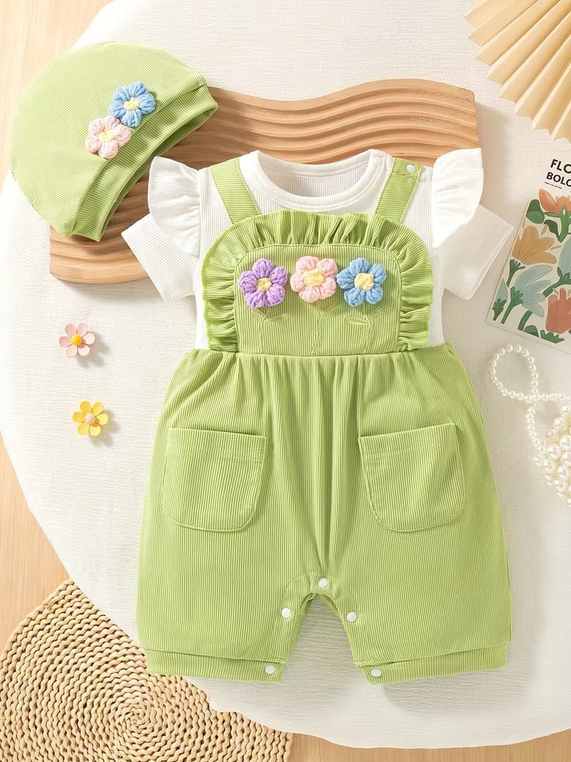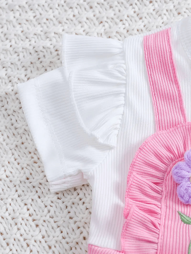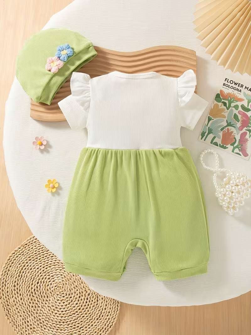 Adorable 3D floral embroidered romper with ruffle sleeves, paired with a matching hat — perfect for a cute and comfy summer look.