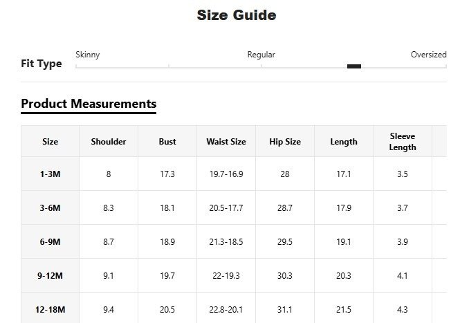 | size | 1-3M, 3-6M, 6-9M, 9-12M, 12-18M |