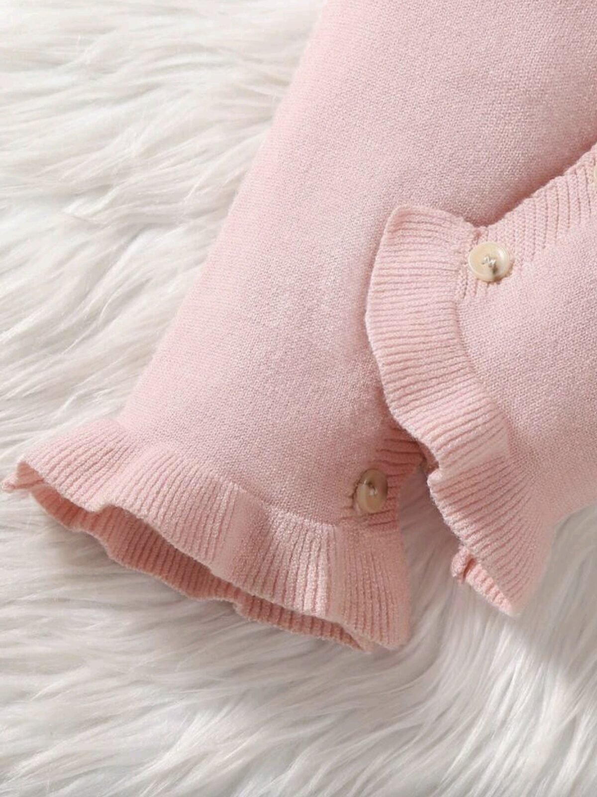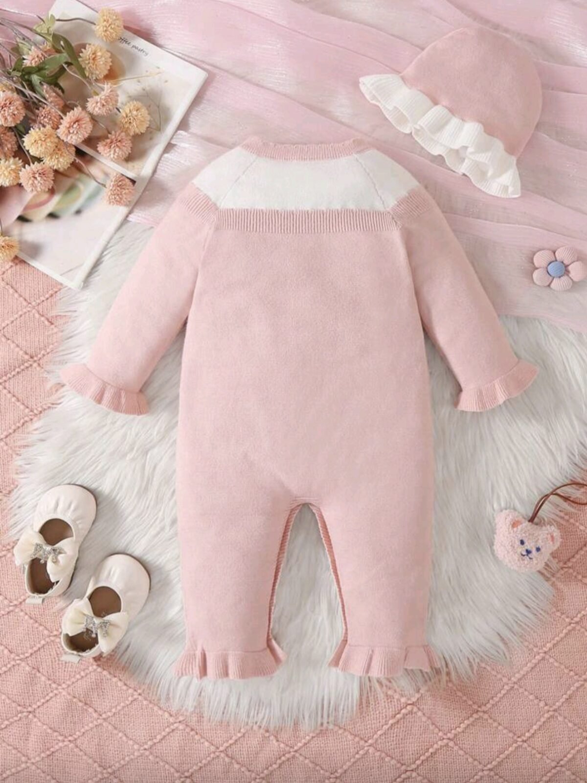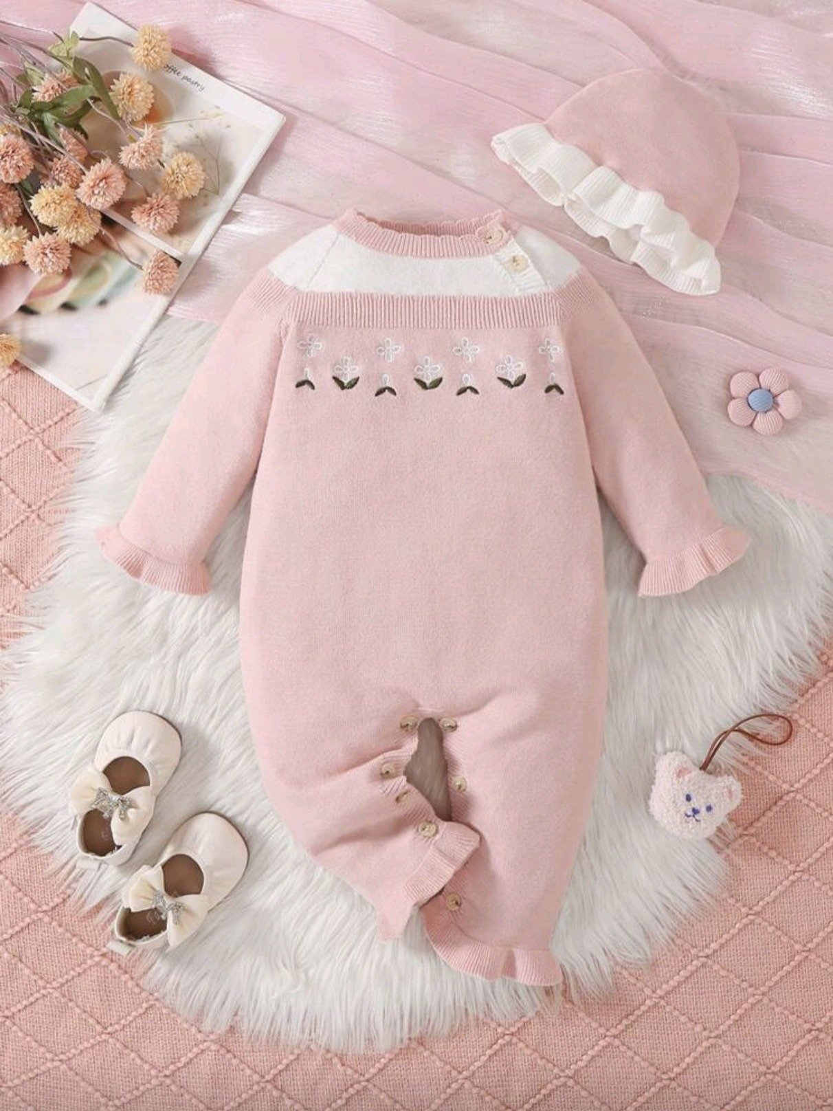 Cozy long-sleeve knitted jumpsuit with floral embroidery and ruffle trim, paired with a matching hat — a warm and adorable outfit for autumn and winter.