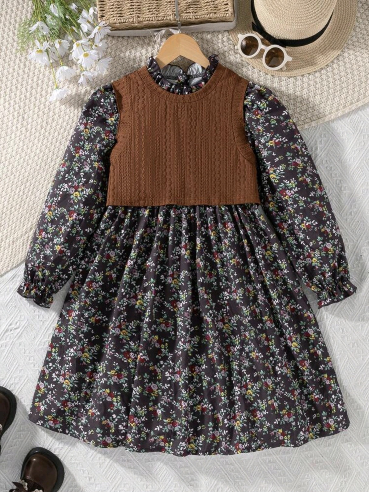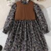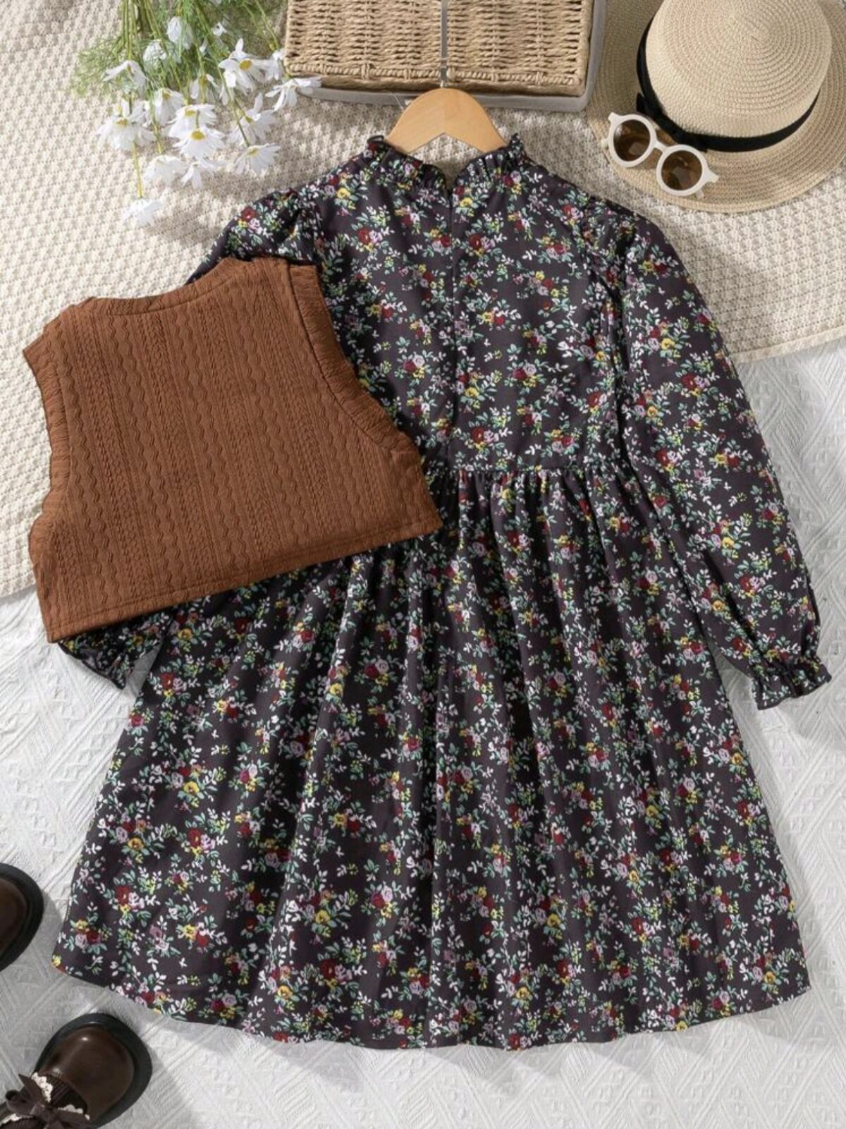 2pcs Girls Floral Dress & Knit Vest – Autumn/Winter Outfit Set