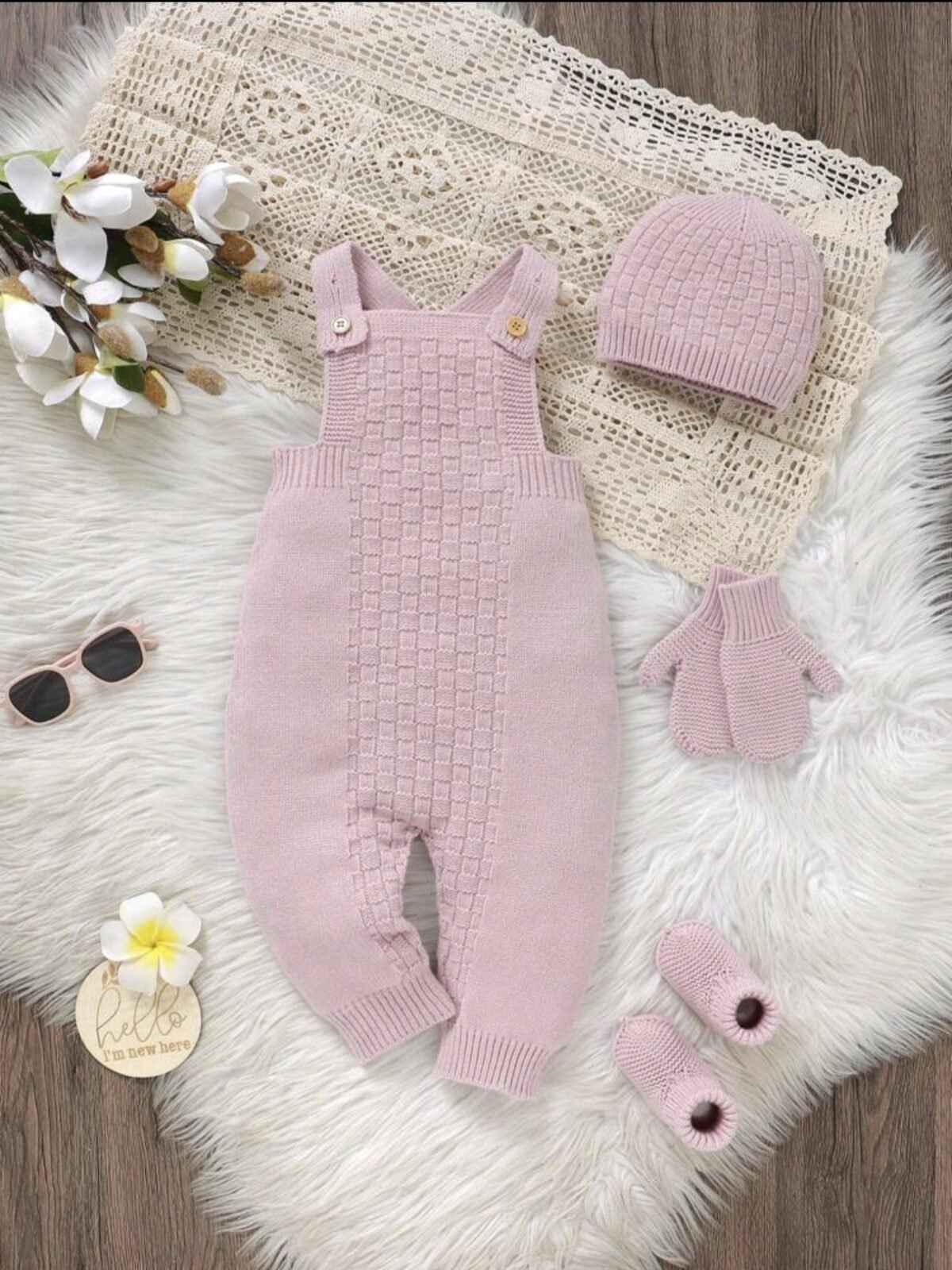 Adorable winter set featuring a cozy pink knit romper with matching cap, gloves, and shoes – perfect for keeping baby girls warm and stylish.