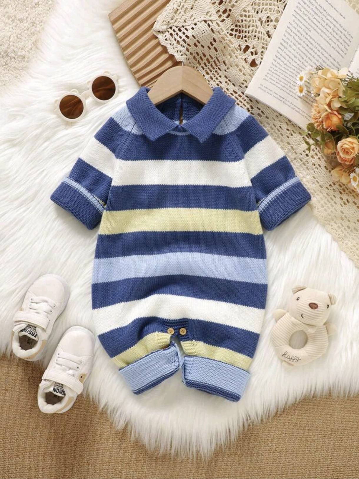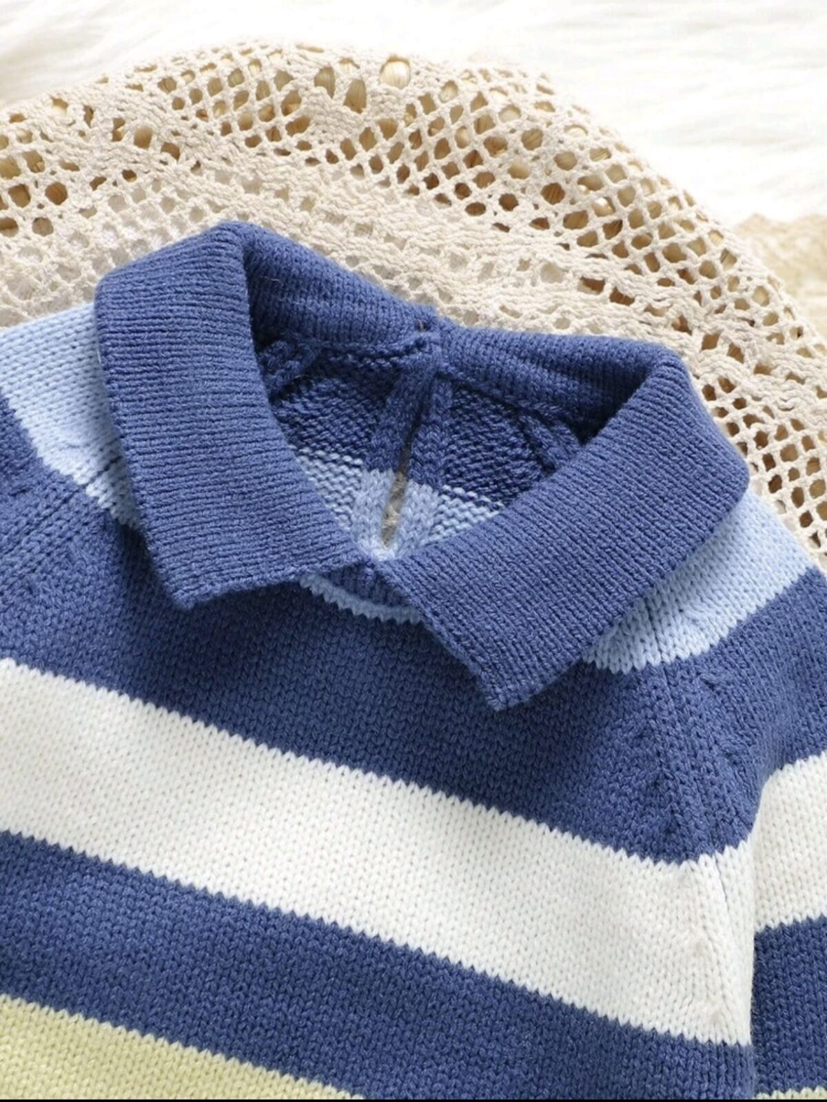 Cozy knitted romper with small collar and charming stripes — a soft, warm, and stylish outfit perfect for baby boys in fall and winter.