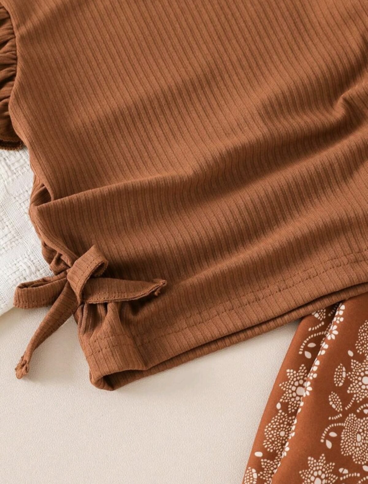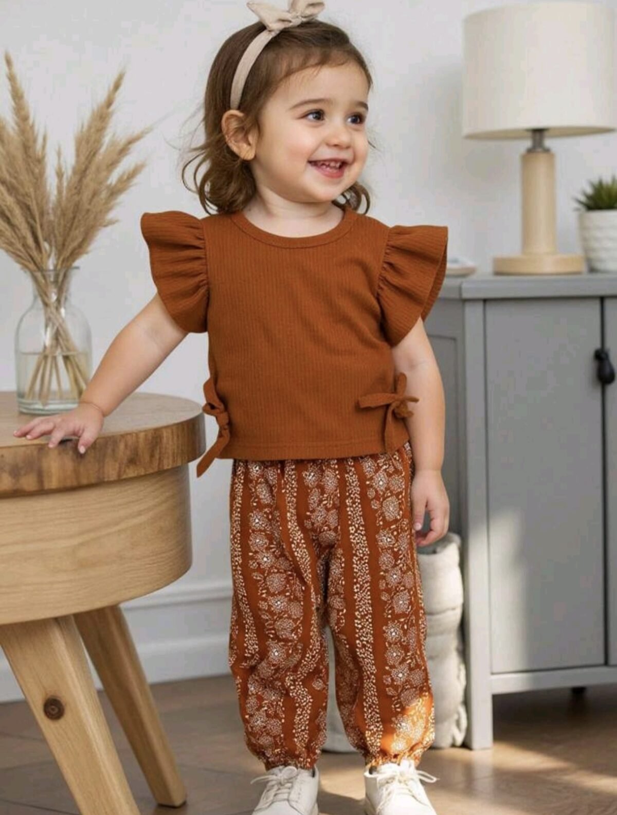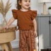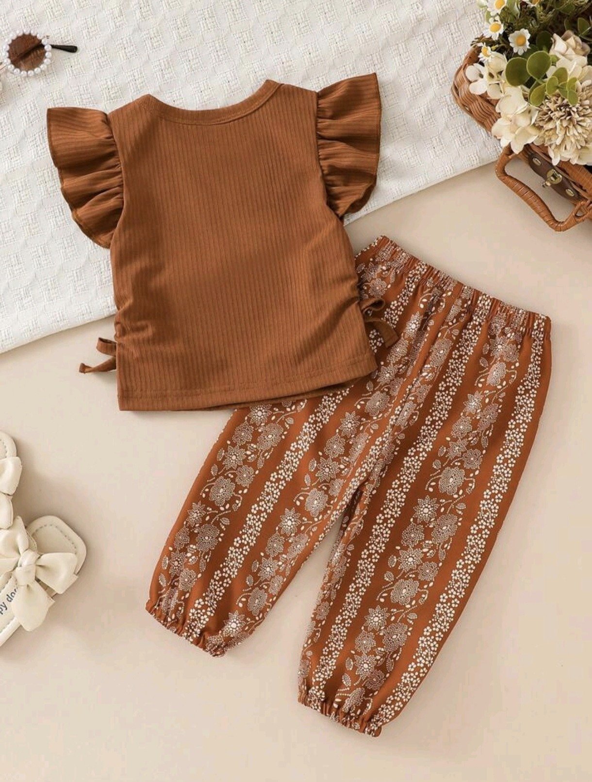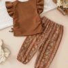 This baby girl 2pcs set features a ribbed flutter sleeve top with floral pants, offering a cute and stylish look. Made from soft, breathable fabric, it’s perfect for summer, daily wear, and outdoor use. A comfortable and trendy outfit for your little one.