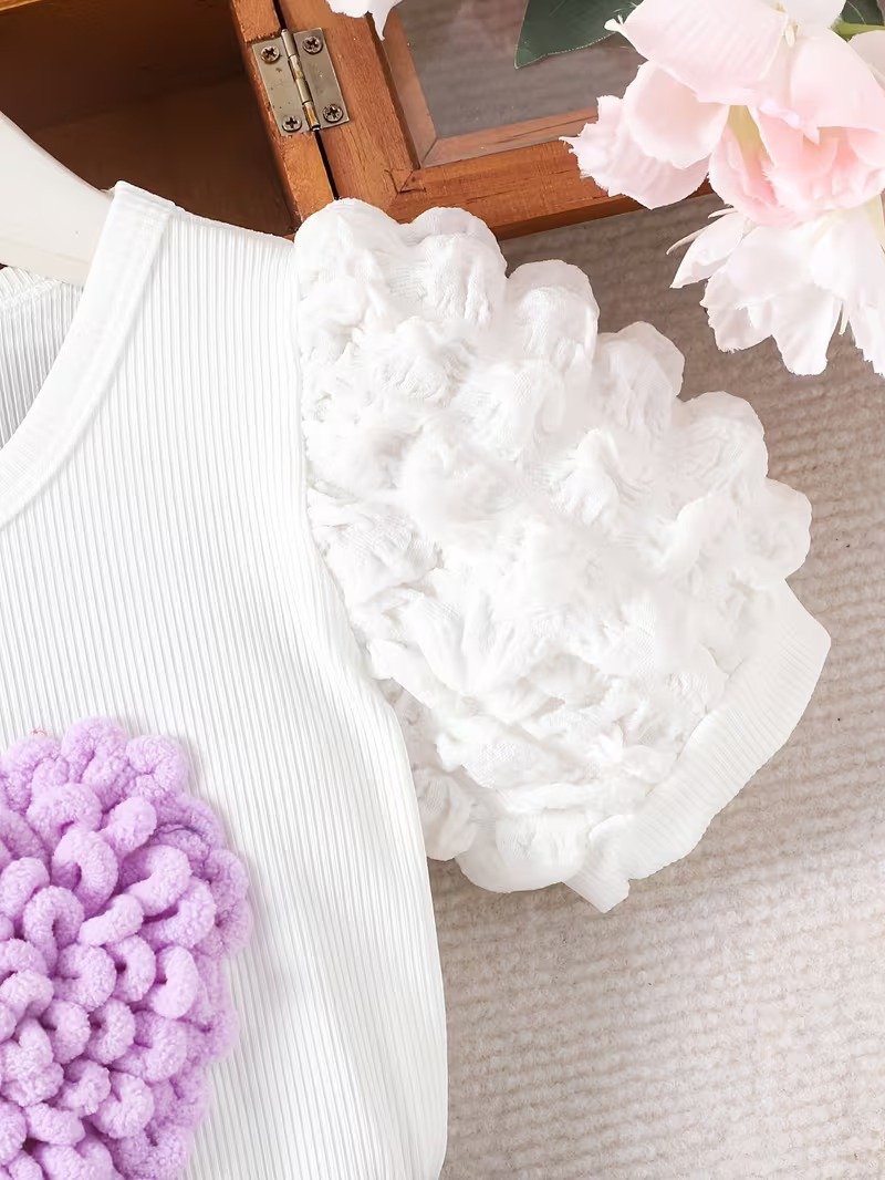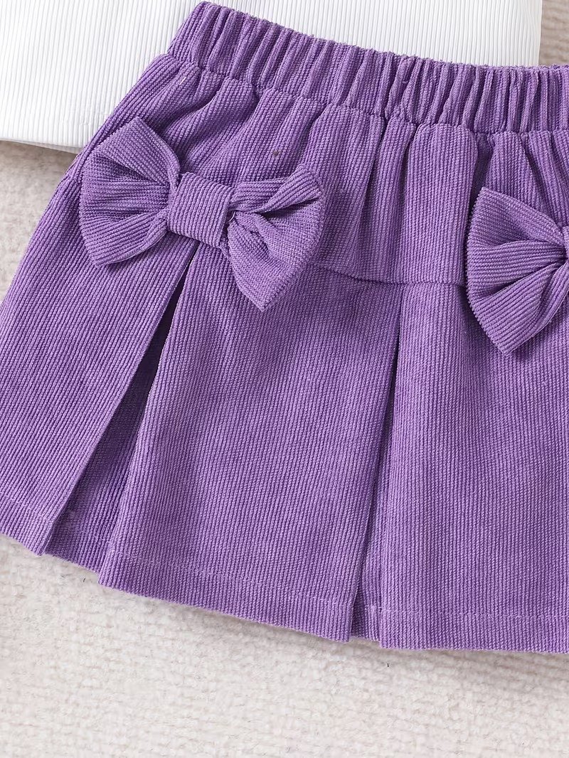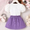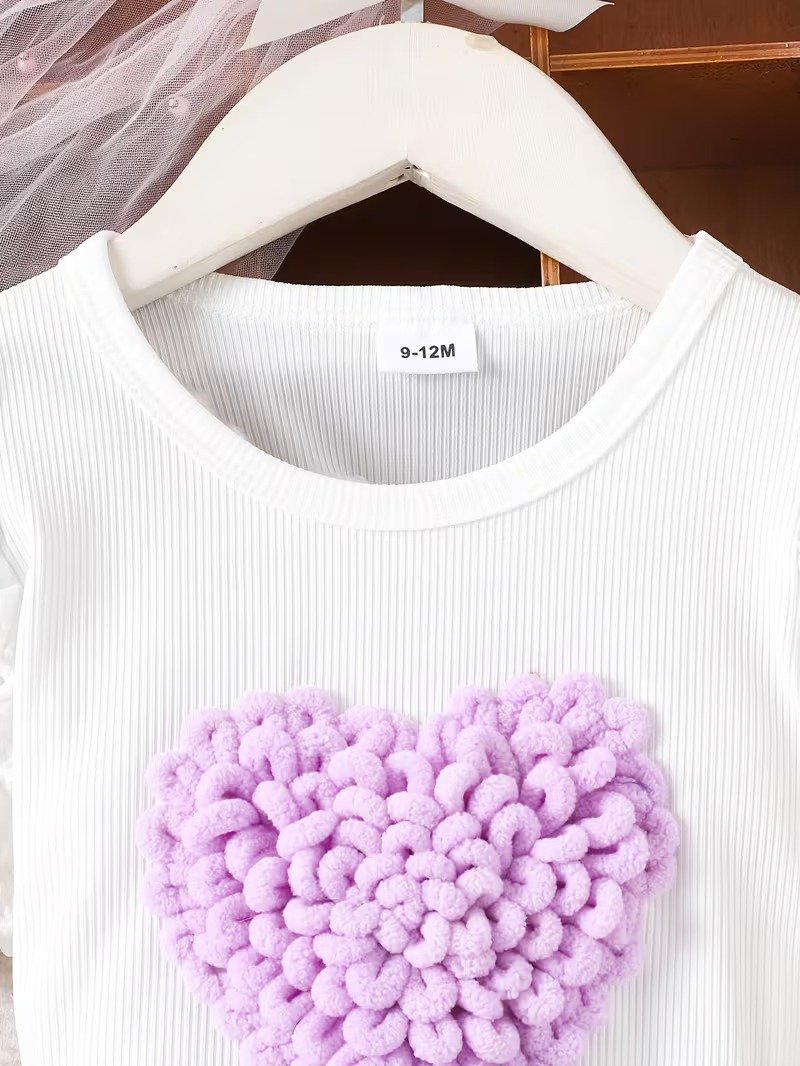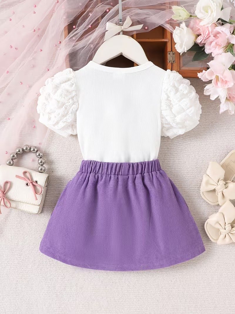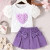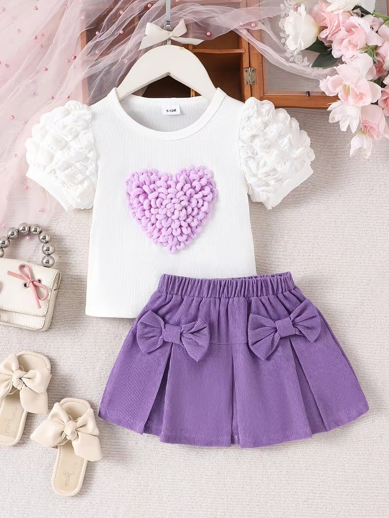 This baby girl 2pcs set features a cute heart design top with a stylish purple skirt and bow detail. Soft and lightweight, perfect for summer, parties, and daily wear.