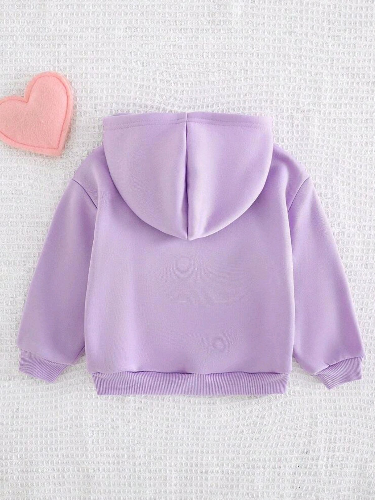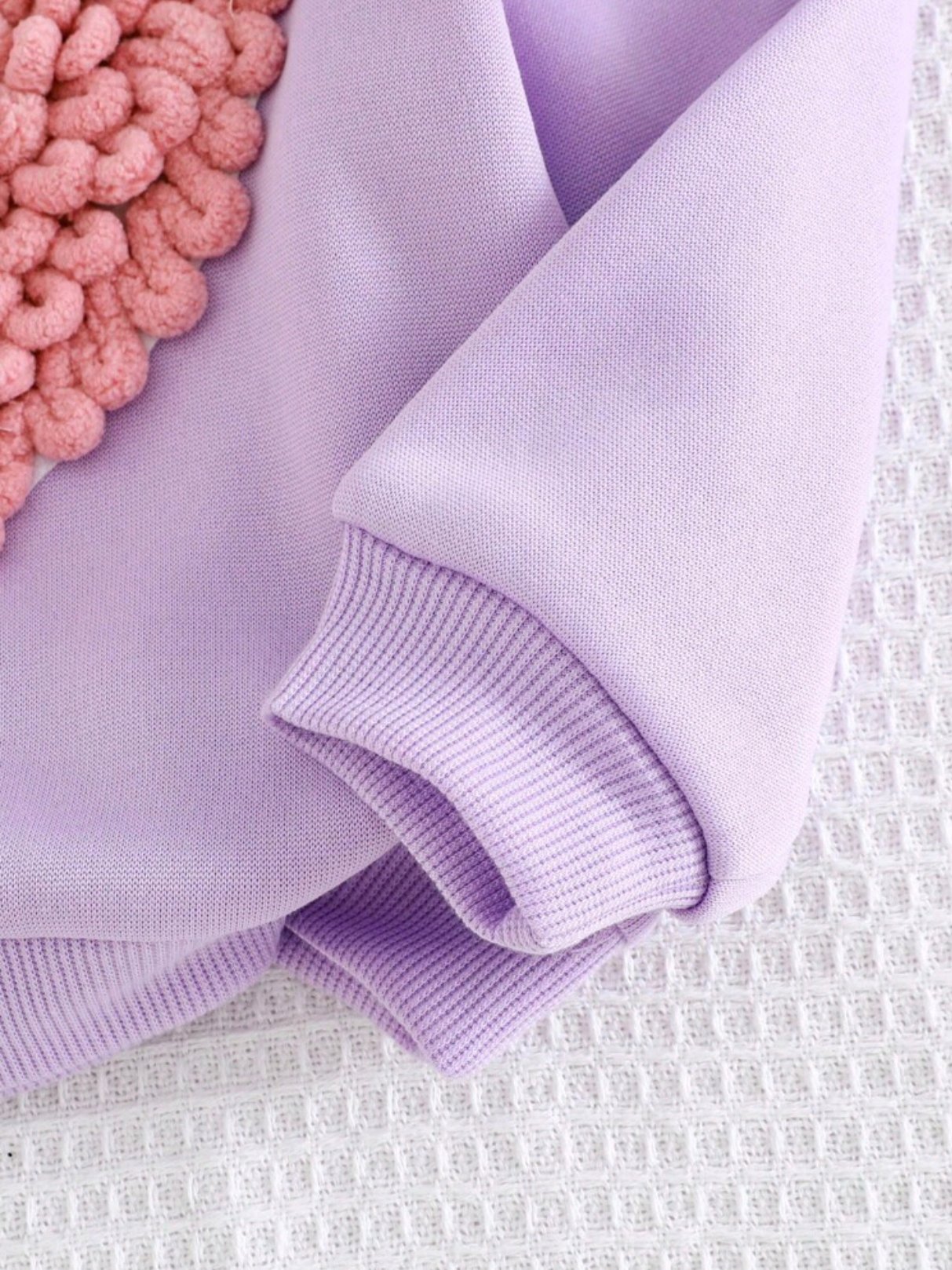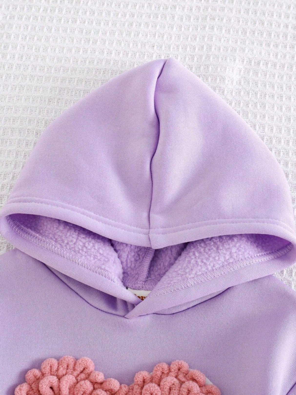 Cozy purple hoodie with a cute 3D heart graphic, made from soft knit fabric – a versatile pullover perfect for baby girls in fall and winter.