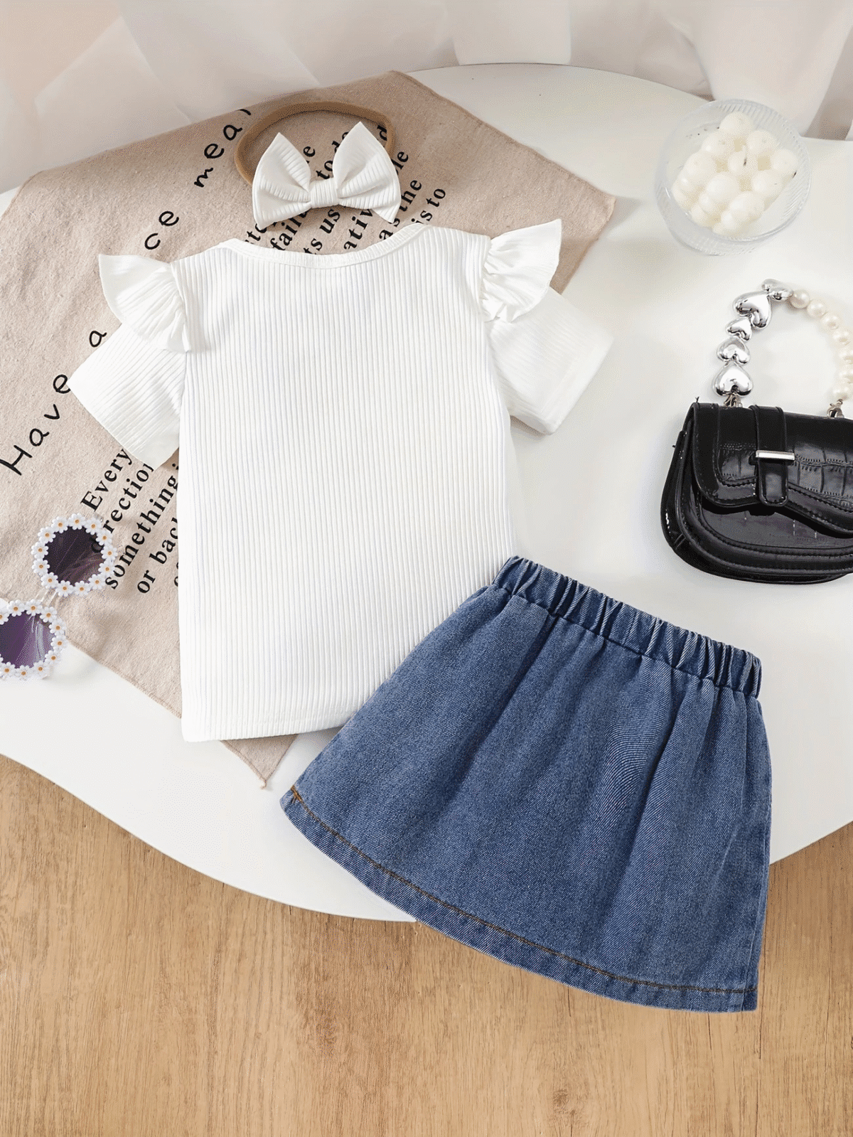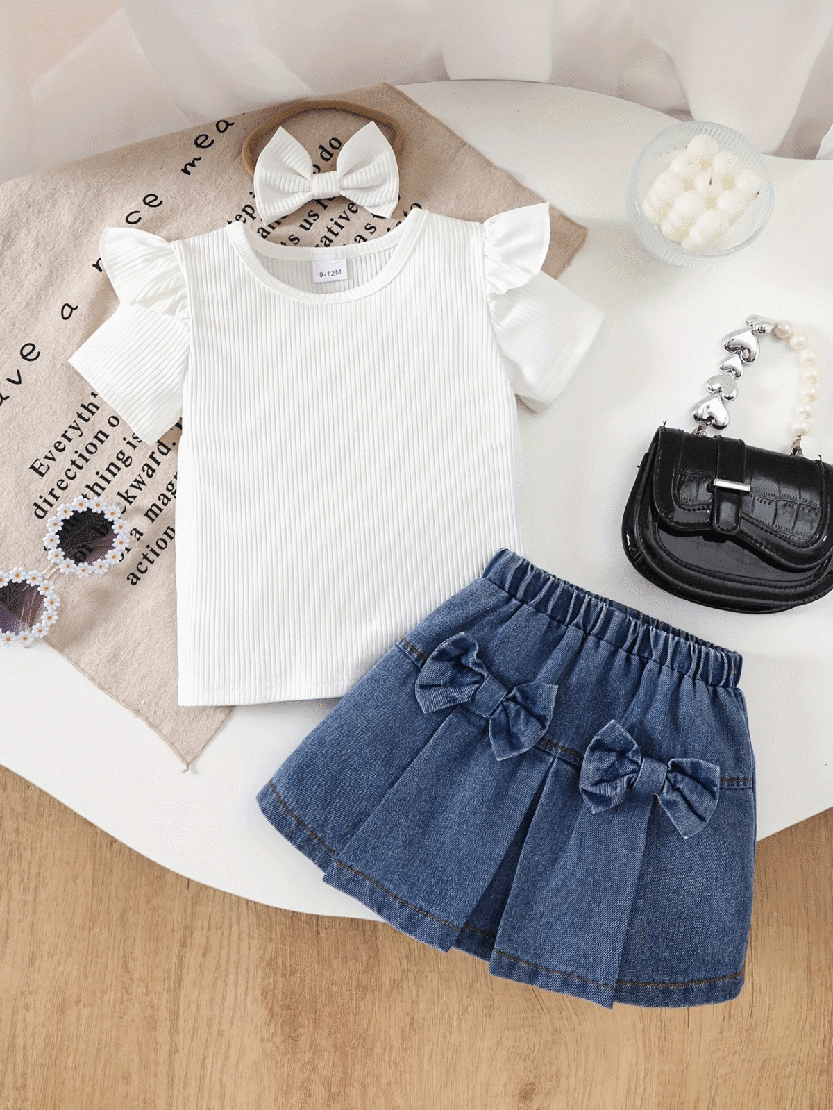 Chic Summer Outfit for Girls – White Top & Navy Bow Skirt,