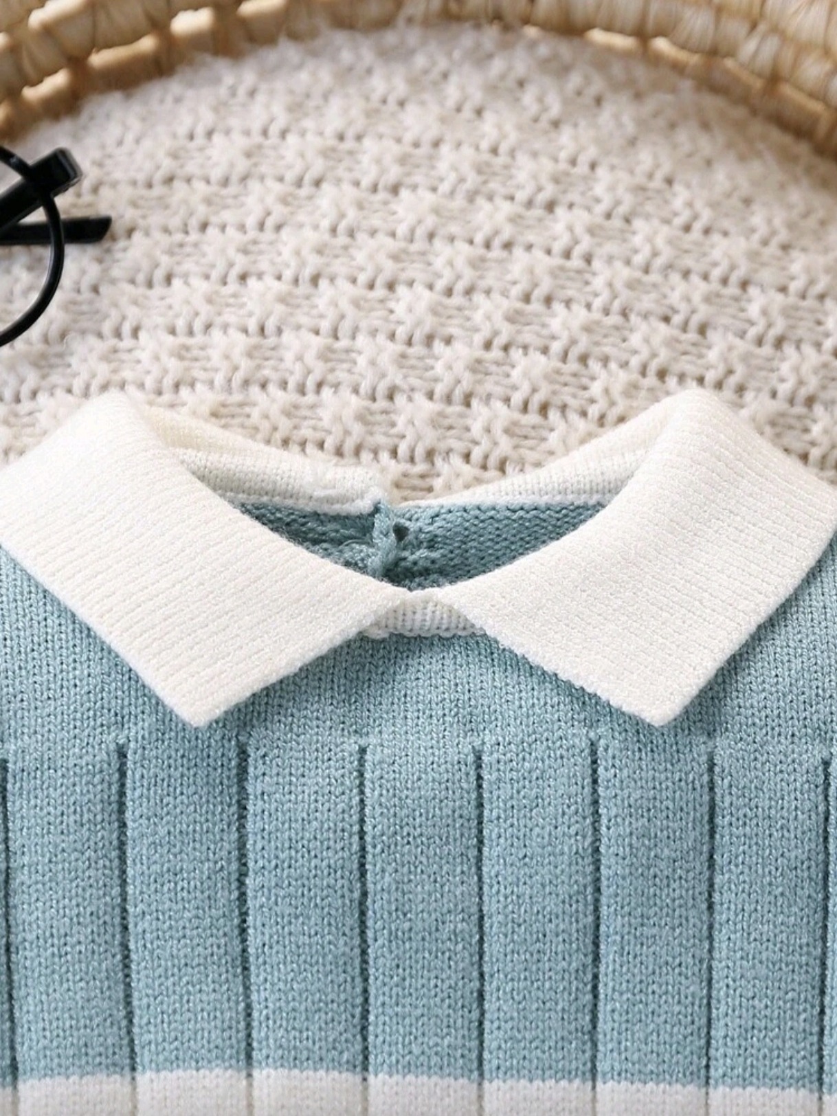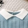 Adorable striped knit sweater romper with a fold-over collar, designed for warmth and comfort — perfect for daily wear, home, or travel in autumn and winter.