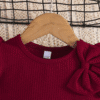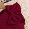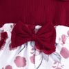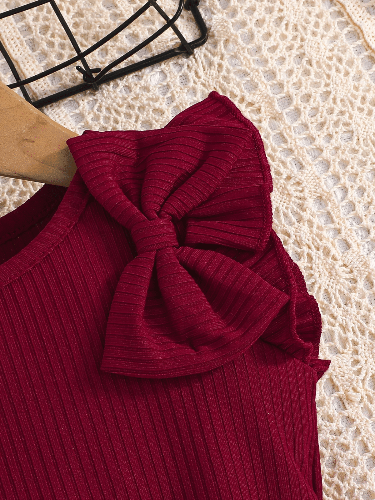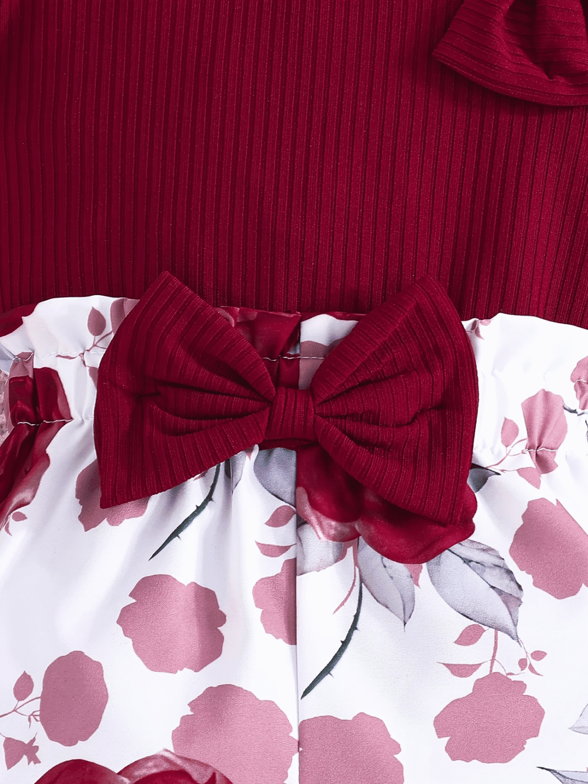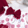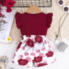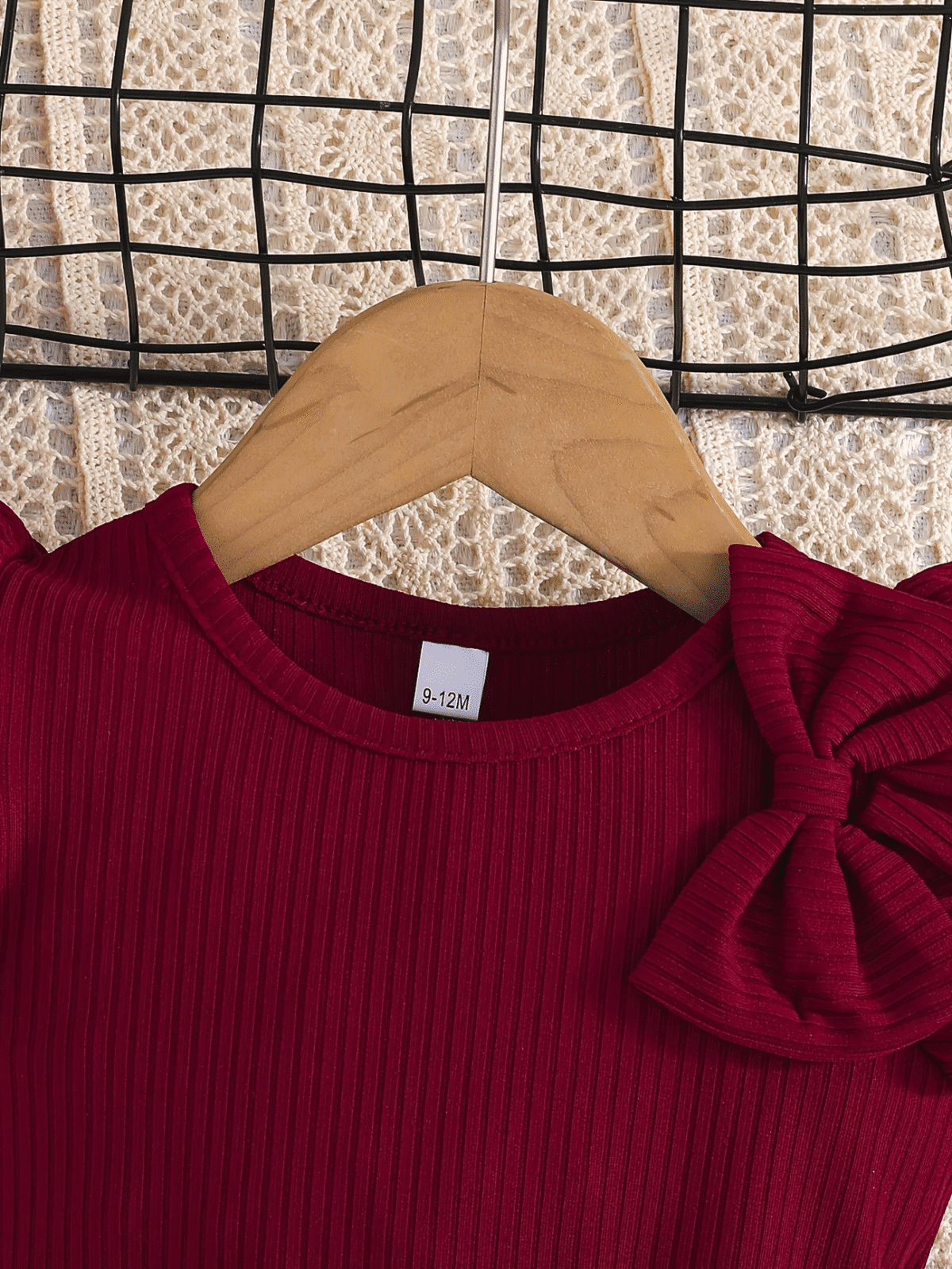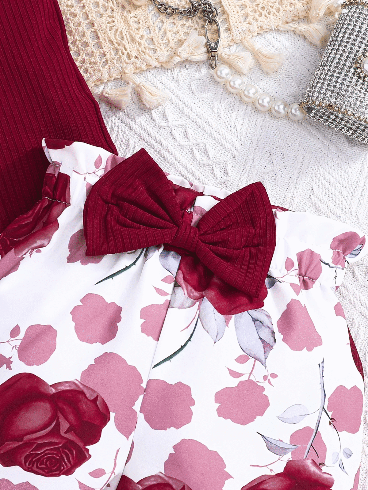 Adorable maroon ribbed T-shirt with bow, paired with floral print shorts – comfy, machine washable, and perfect for summer outdoor fun.