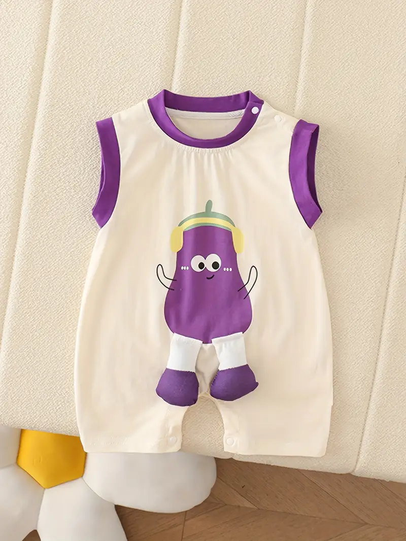 Adorable sleeveless romper made from a soft cotton blend, featuring a fun orange pumpkin cartoon design. Lightweight and comfy, perfect for summer outings and playtime.