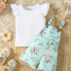 Charming 2-piece romper suit featuring a pleated sleeve top with floral strap pocket shorts and diaper pants. Lightweight, comfy, and perfect for outdoor summer adventures.