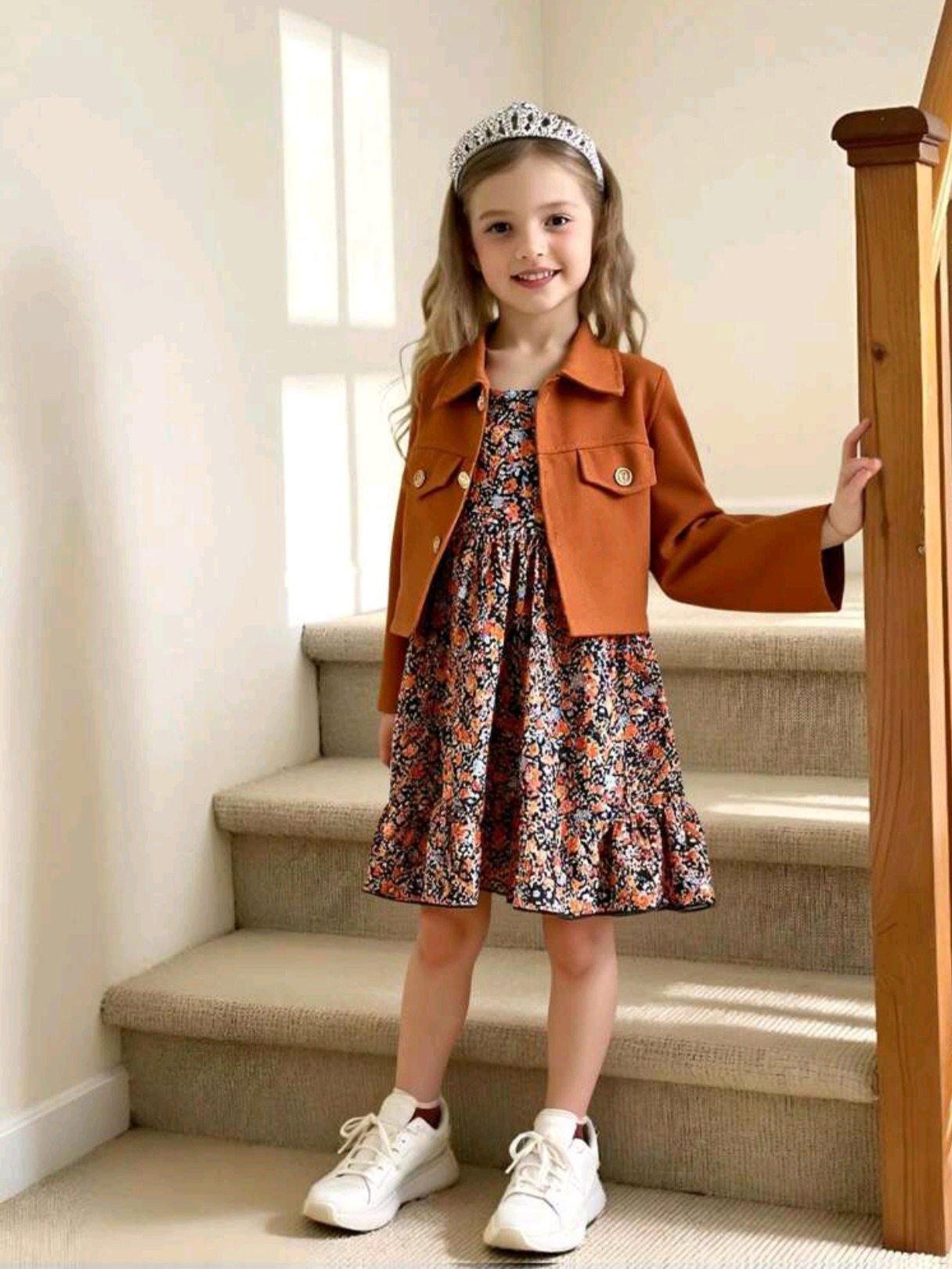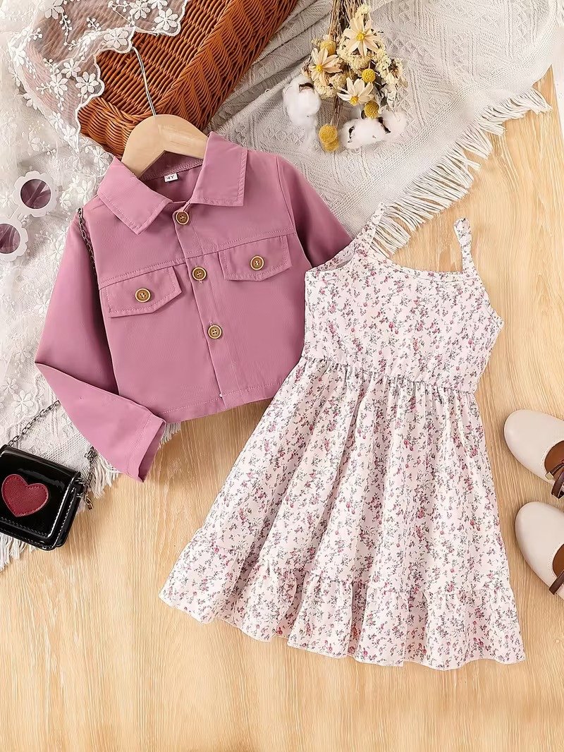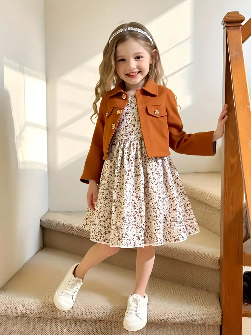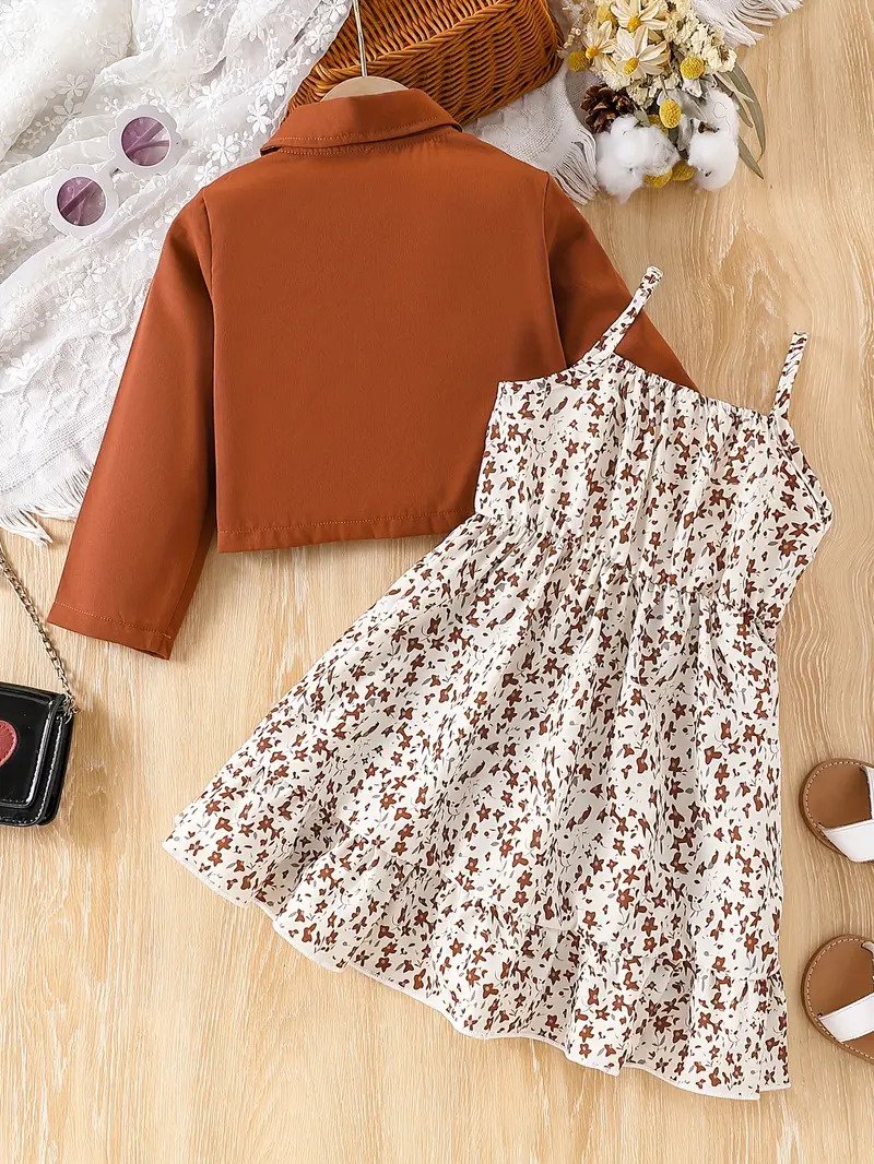 Girls Floral Dress and Jacket Set – Stylish 2-piece outfit with a solid long-sleeve short jacket and floral print dress, perfect for spring/summer outdoor wear, vacations, and parties.