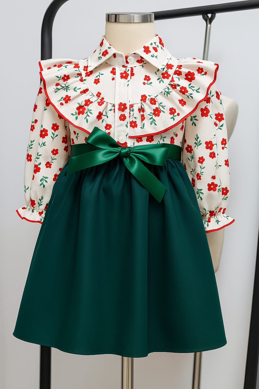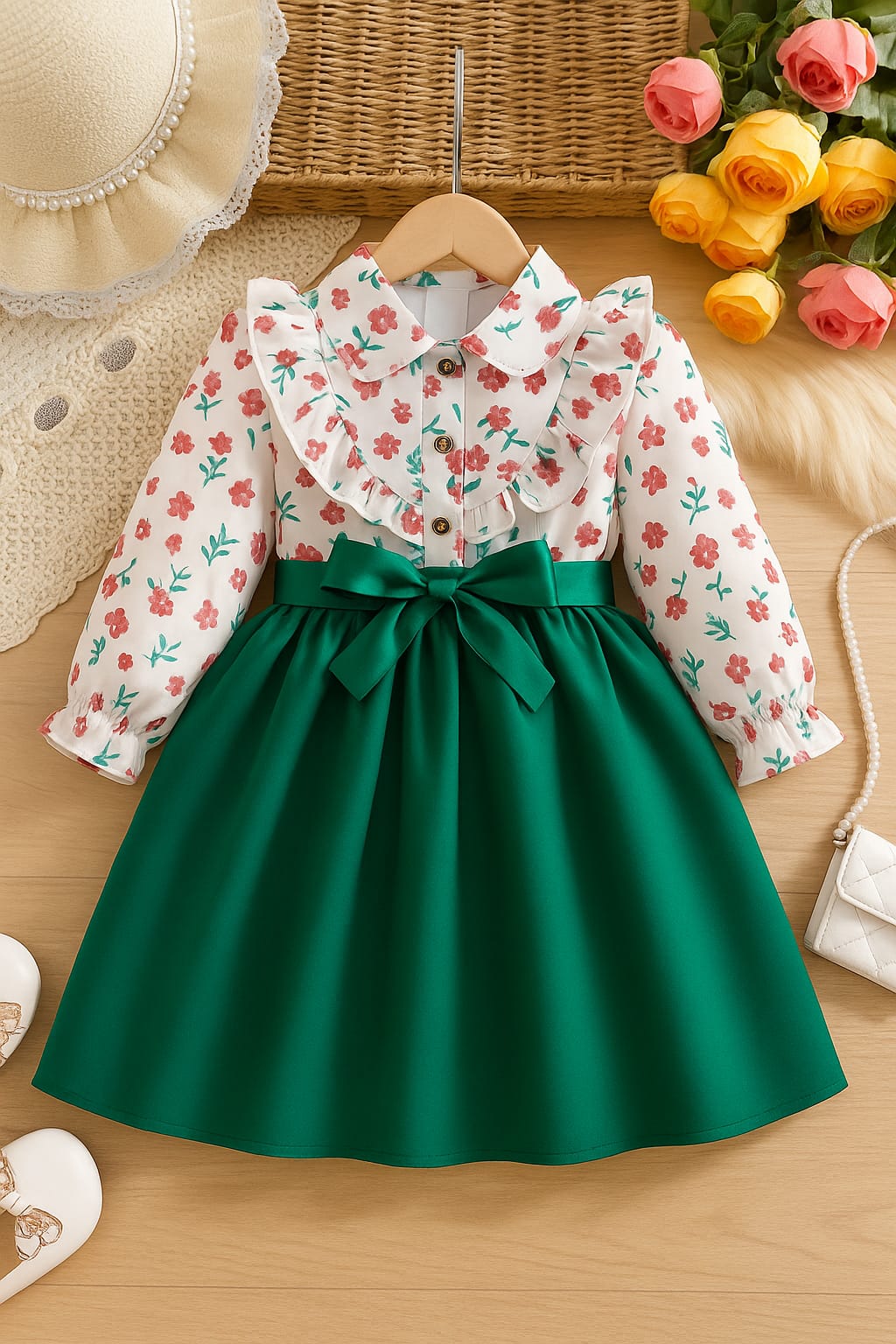 Girls Floral Ruffle Top & Green Bow Dress – Elegant Party Outfit