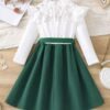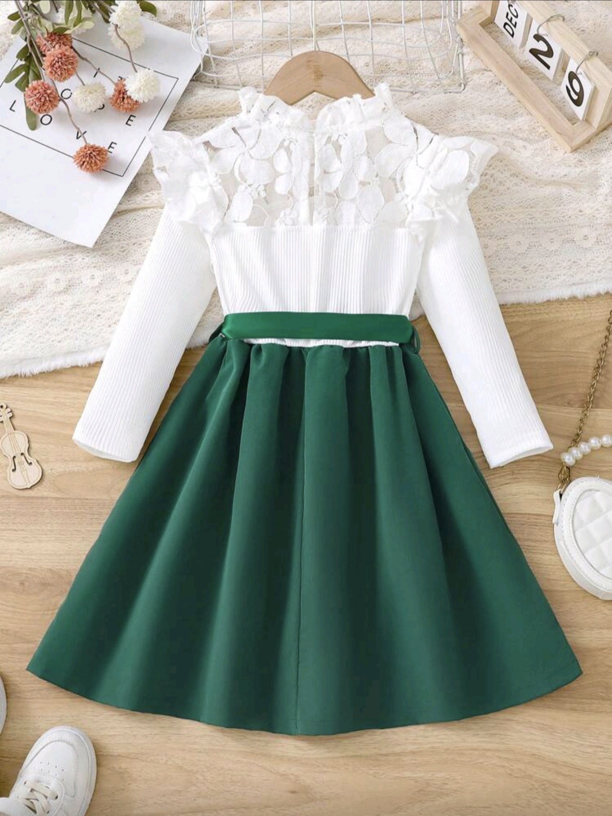Girls Lace Patchwork Princess Dress – Ribbed Long Sleeve with Belt