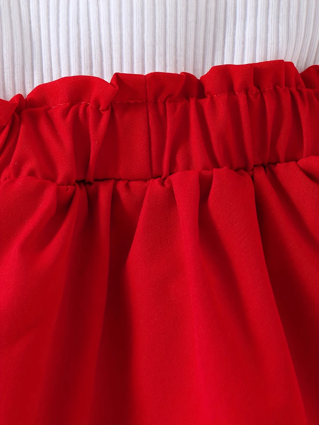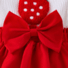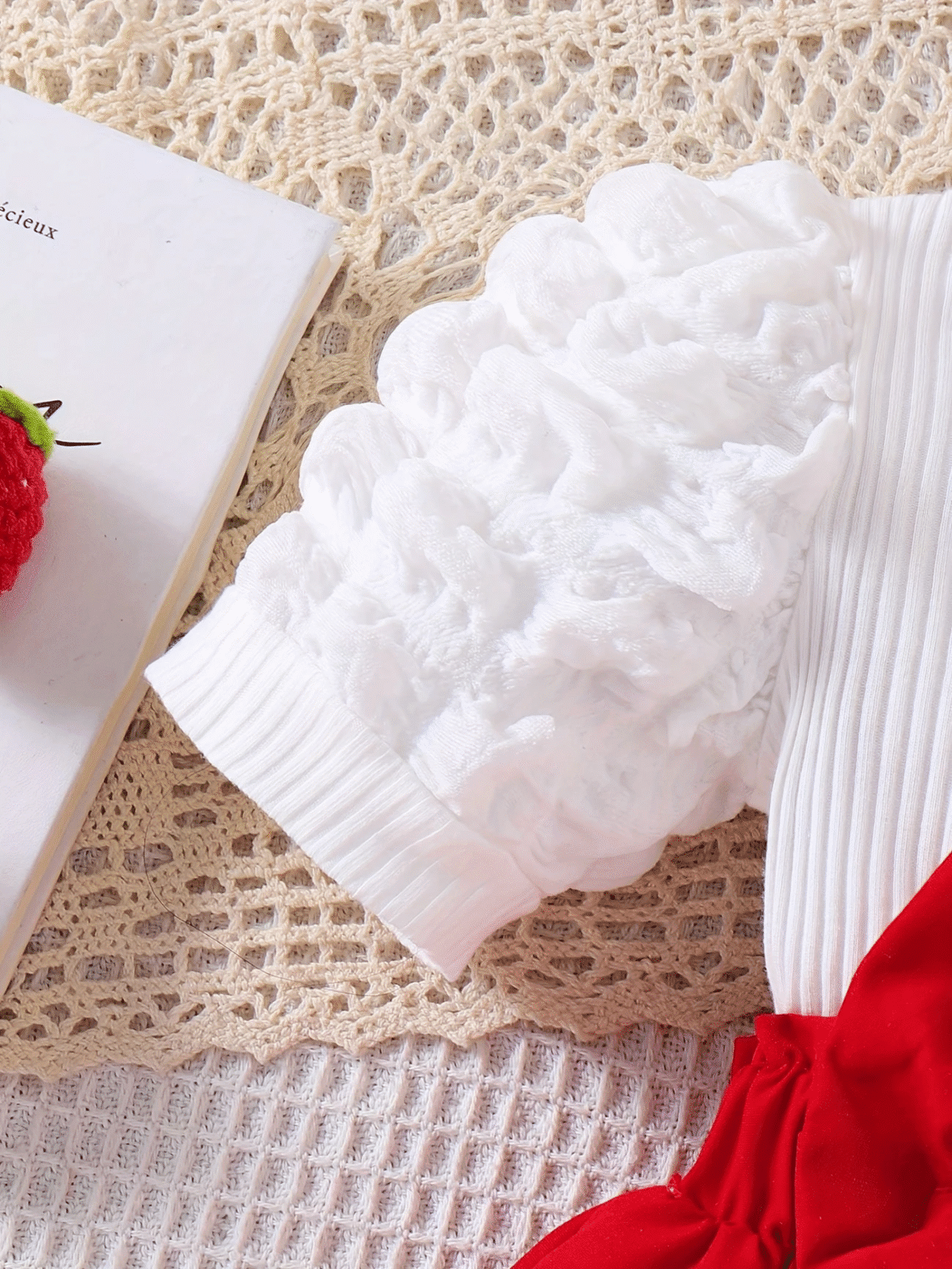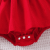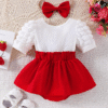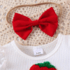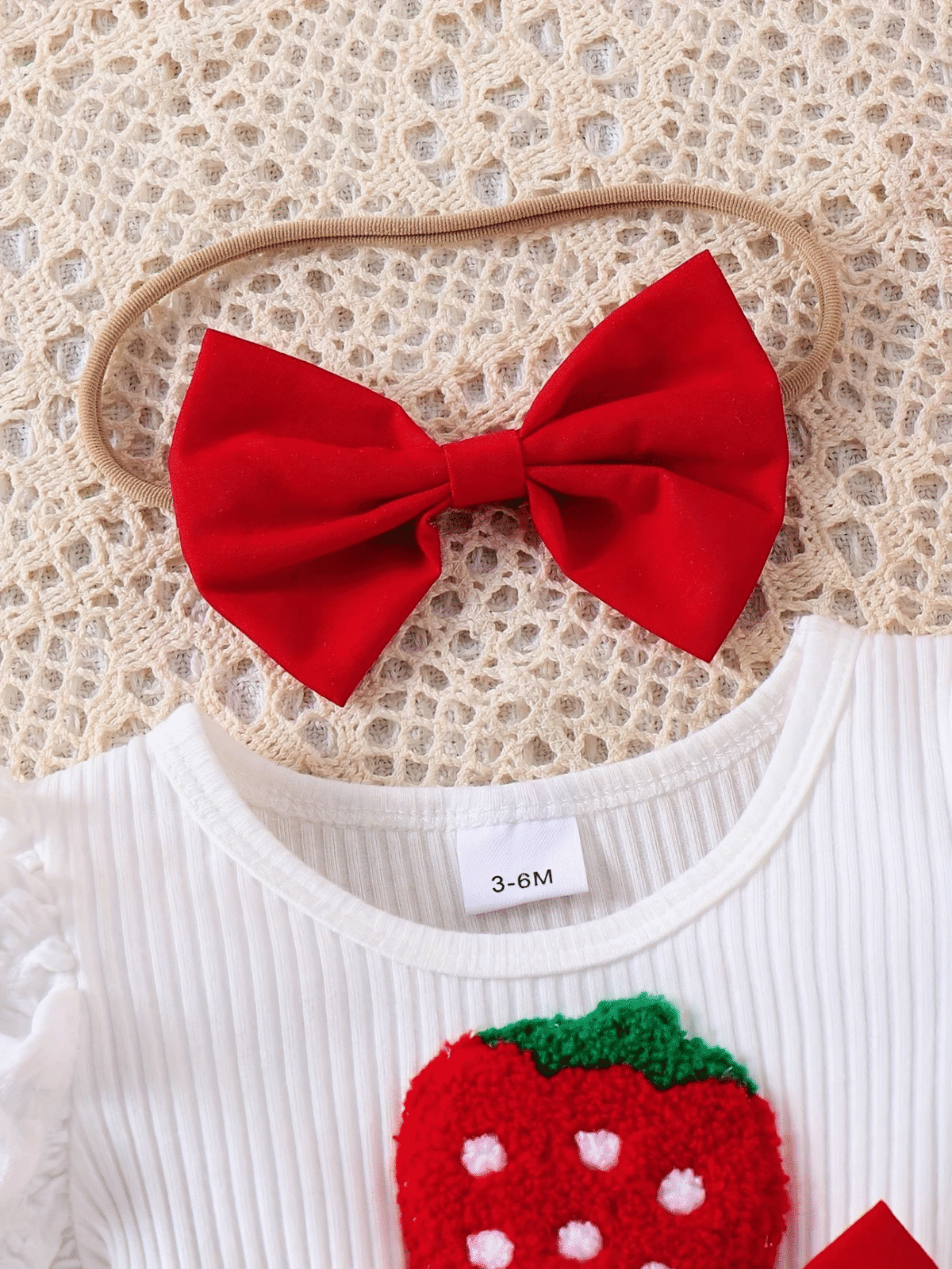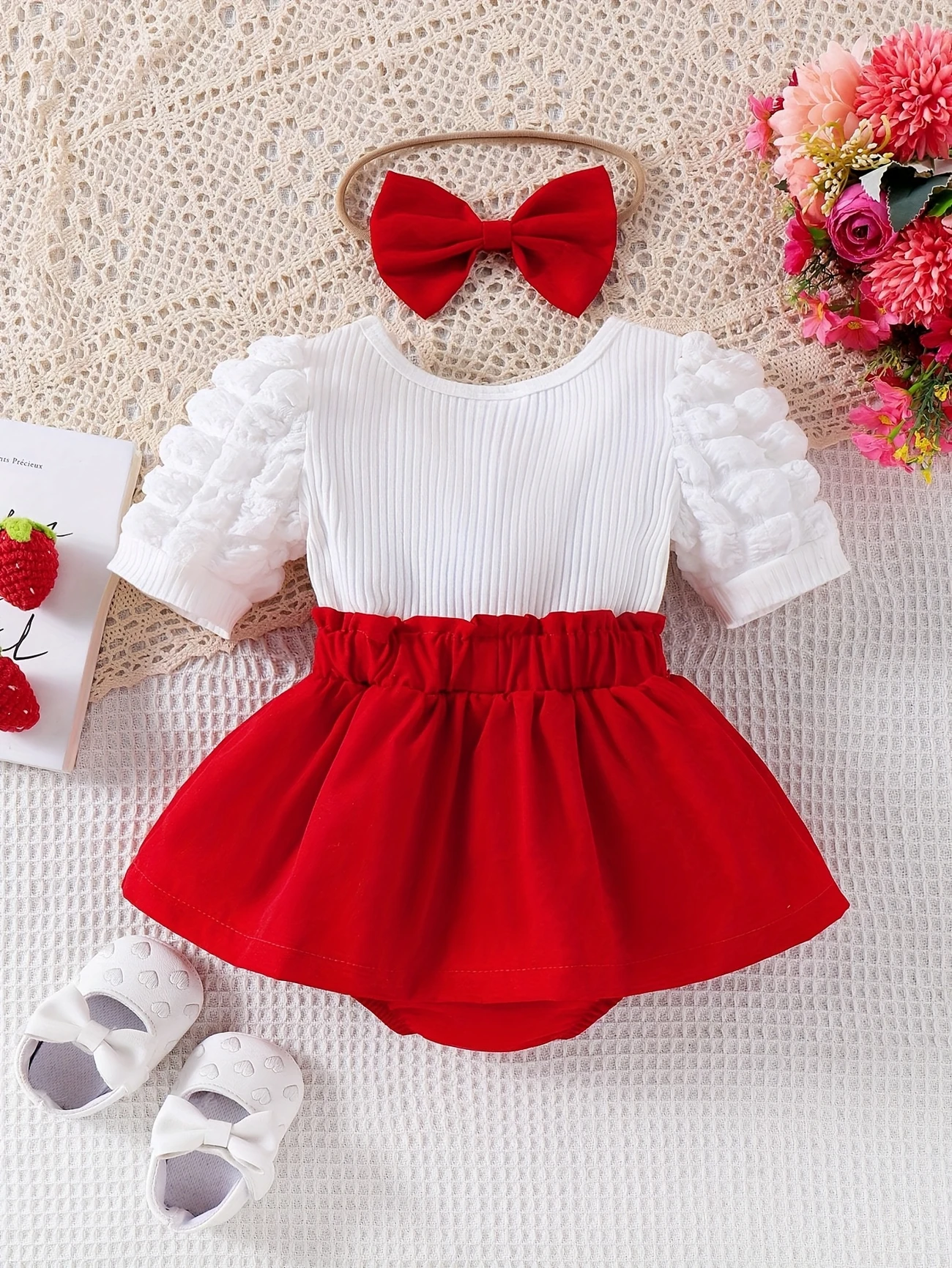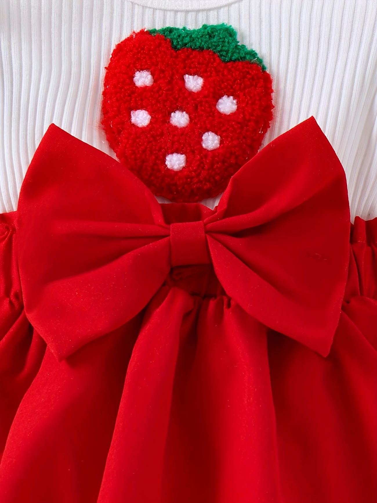 Adorable 2-piece summer set with strawberry-embroidered ribbed suspender dress, puff sleeves, 3D bow hem, and matching headband – perfect for outdoor fun.