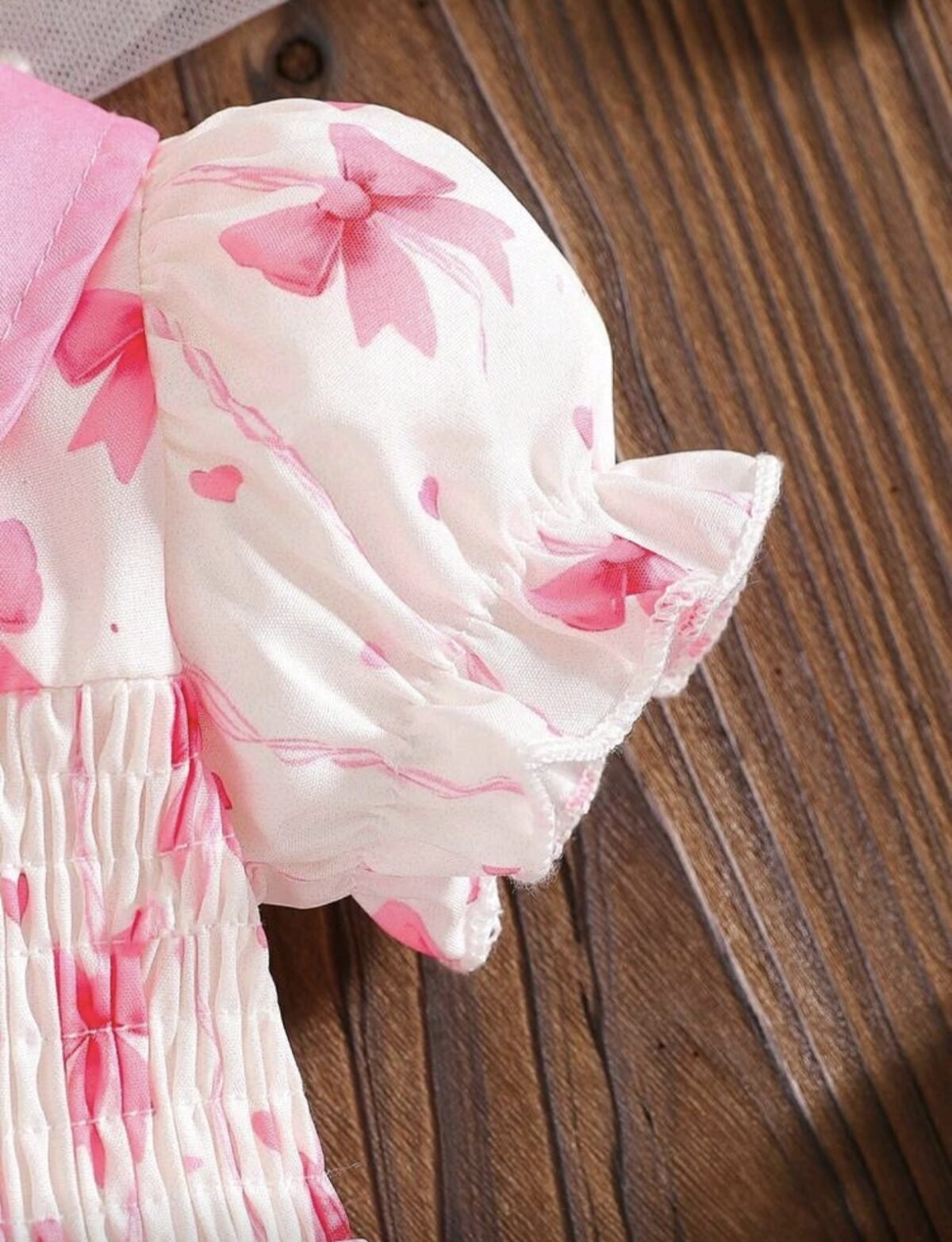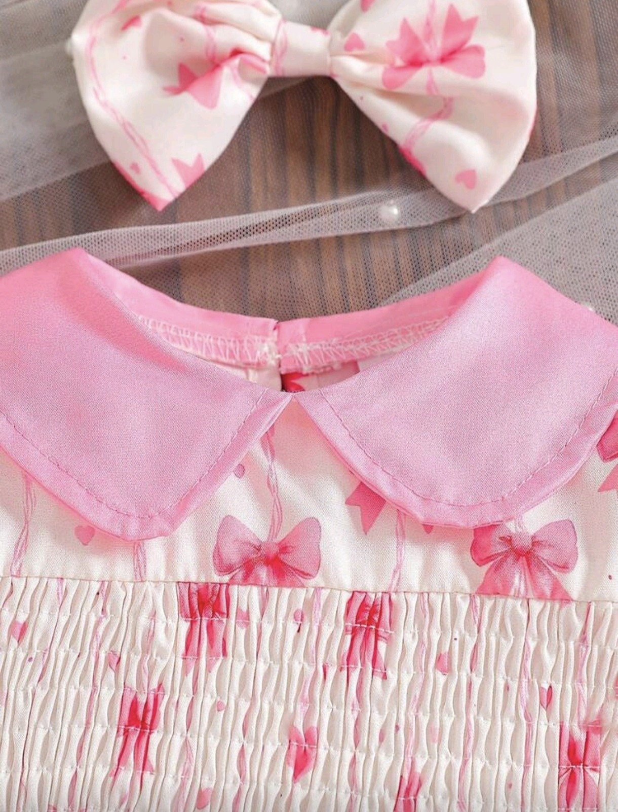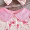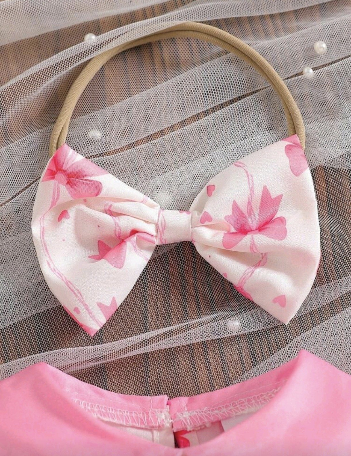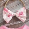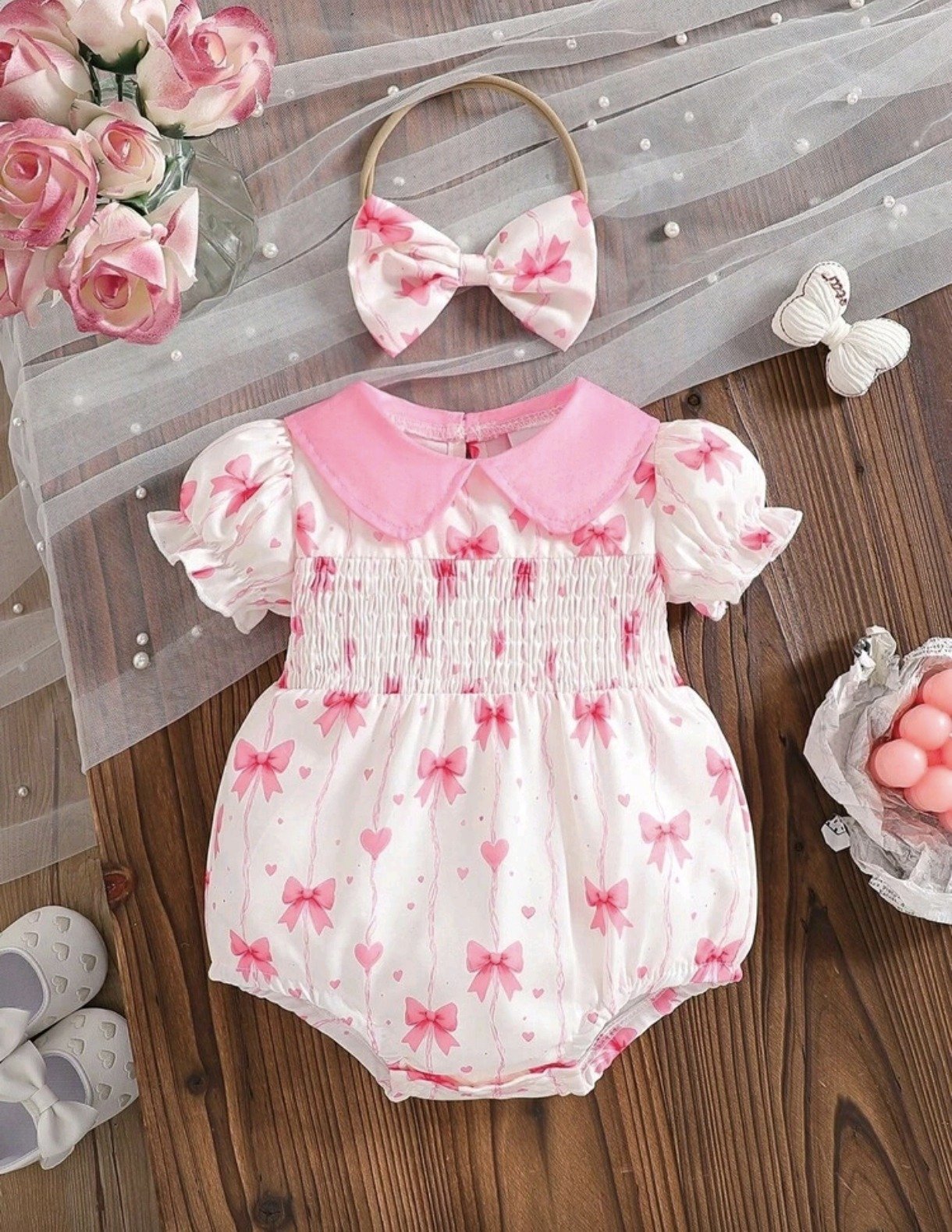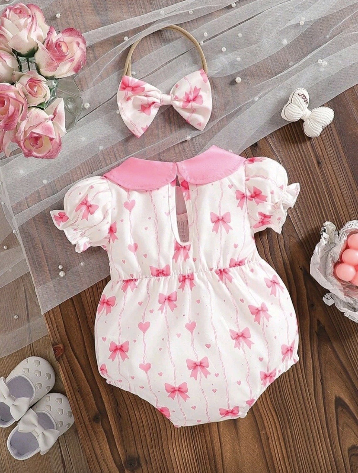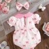 Newborn Baby Girl Bow Print Bodysuit – Ruffle Collar Set with Headband: This baby girl bodysuit set features a cute bow print design with ruffle collar and puff sleeves, paired with a matching headband. Soft and breathable, perfect for summer, daily wear, and photoshoots.