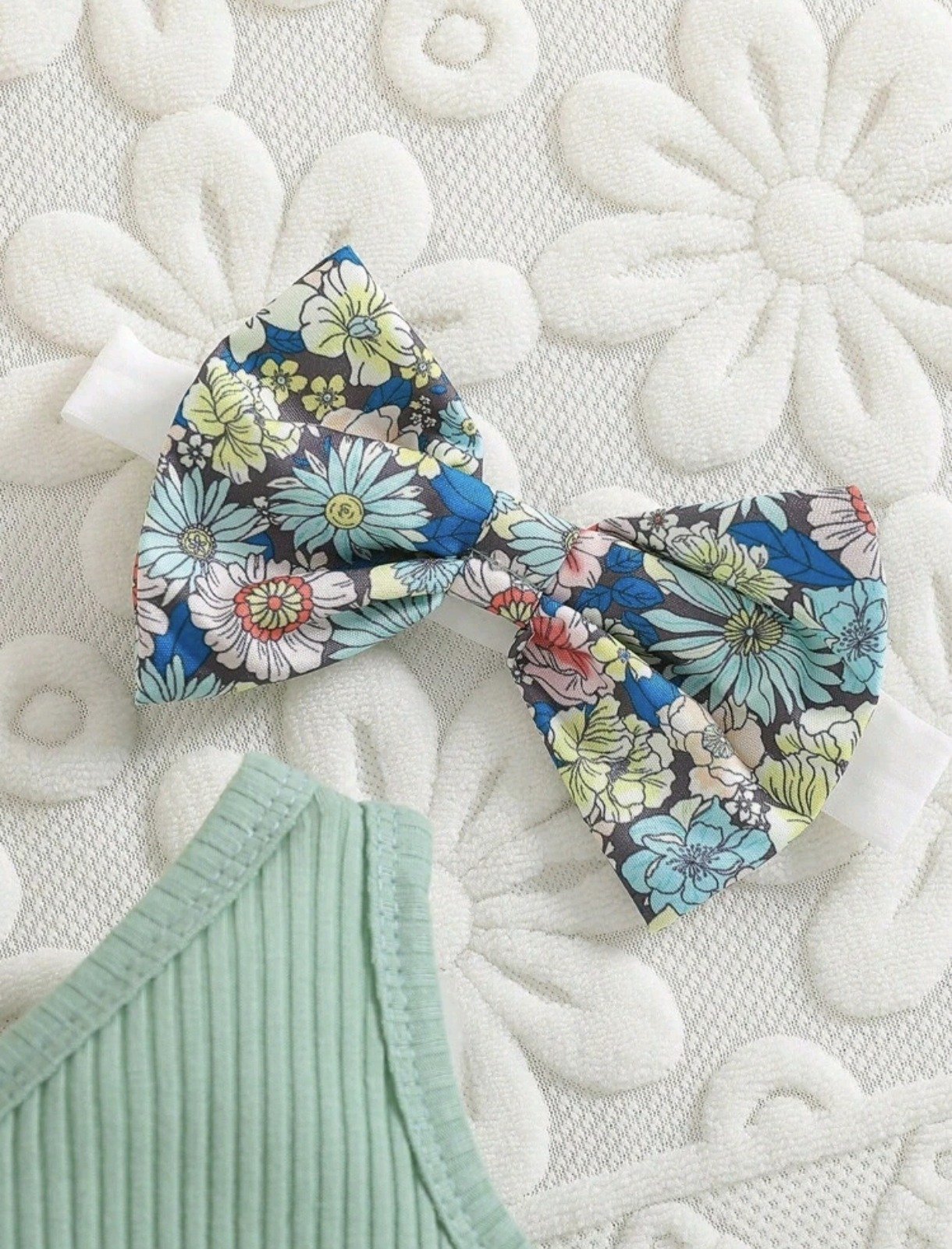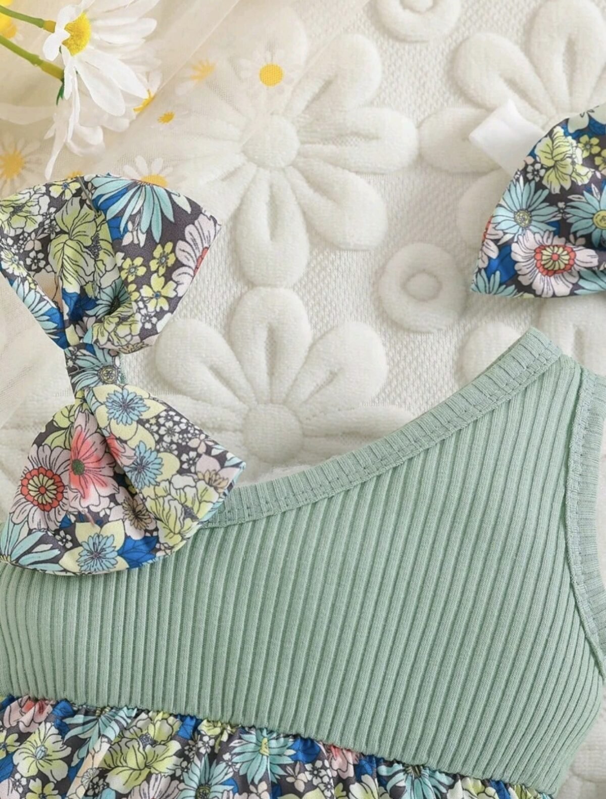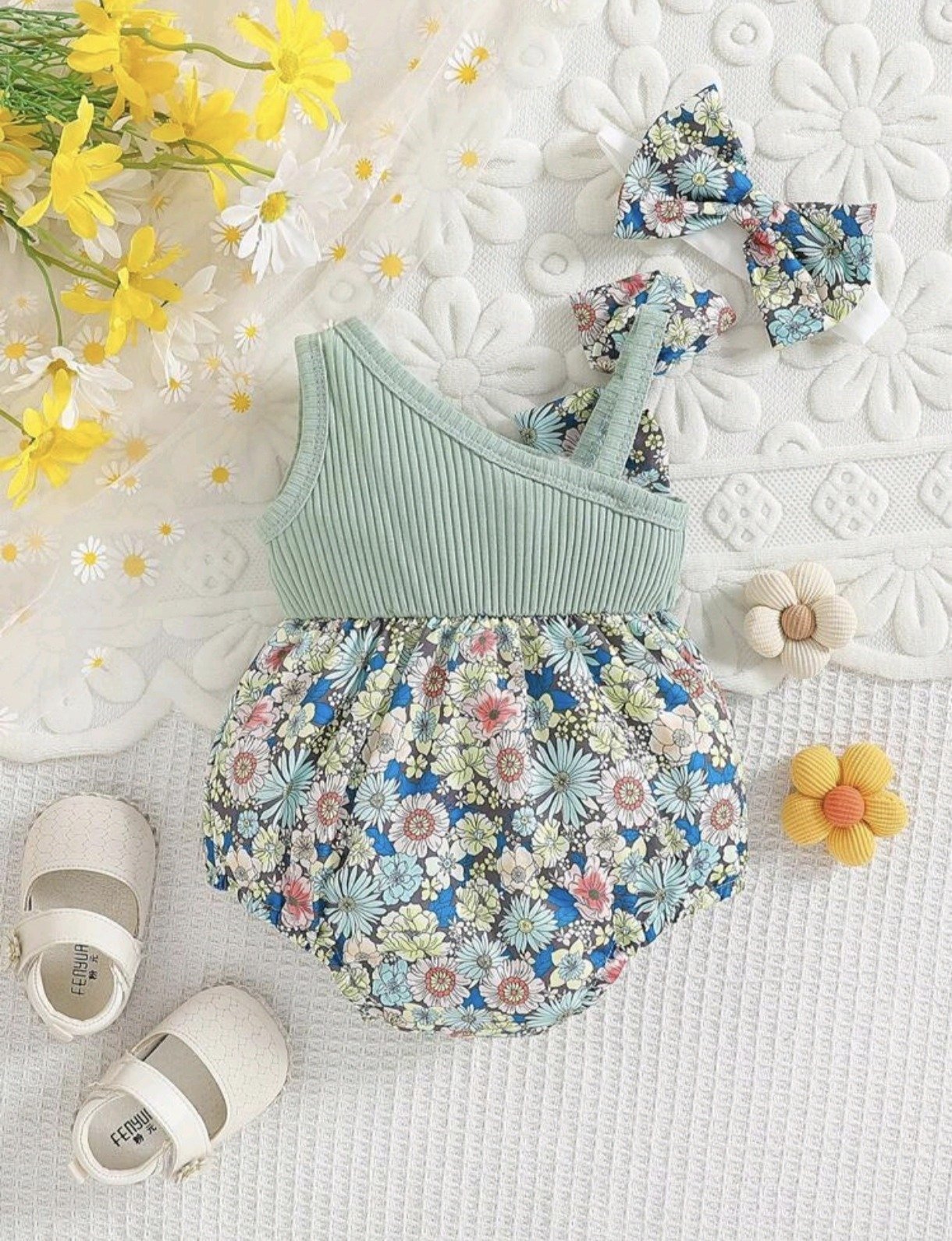 Sweet floral spaghetti strap bodysuit with bow detail and matching headband — lightweight, breezy, and perfect for summer outings.