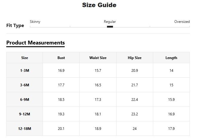 | size | 1-3M, 3-6M, 6-9M, 9-12M, 12-18M |