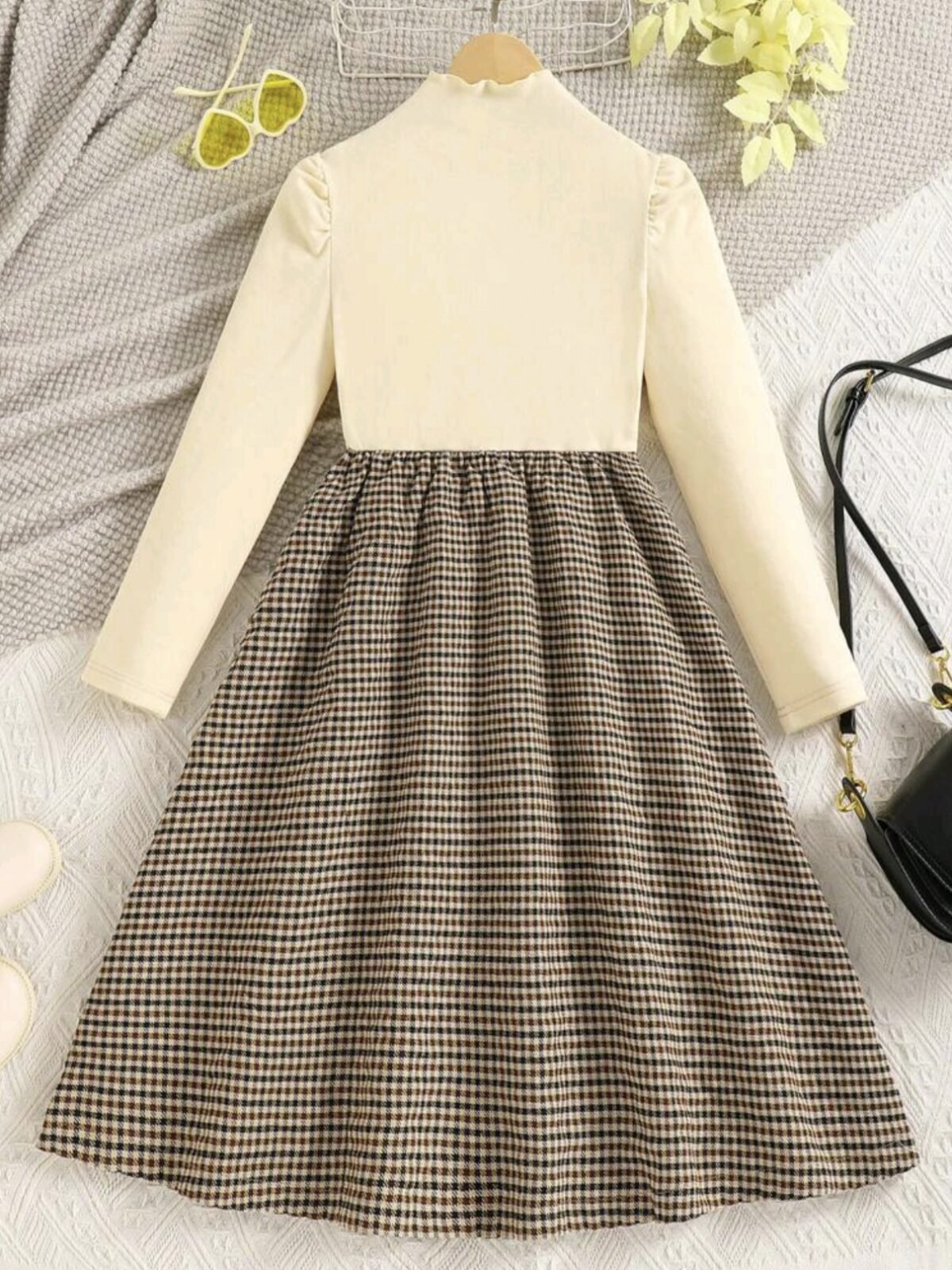 Chic long-sleeve dress with embroidery patchwork and button-front design, perfect for keeping tween girls cozy and stylish in winter.